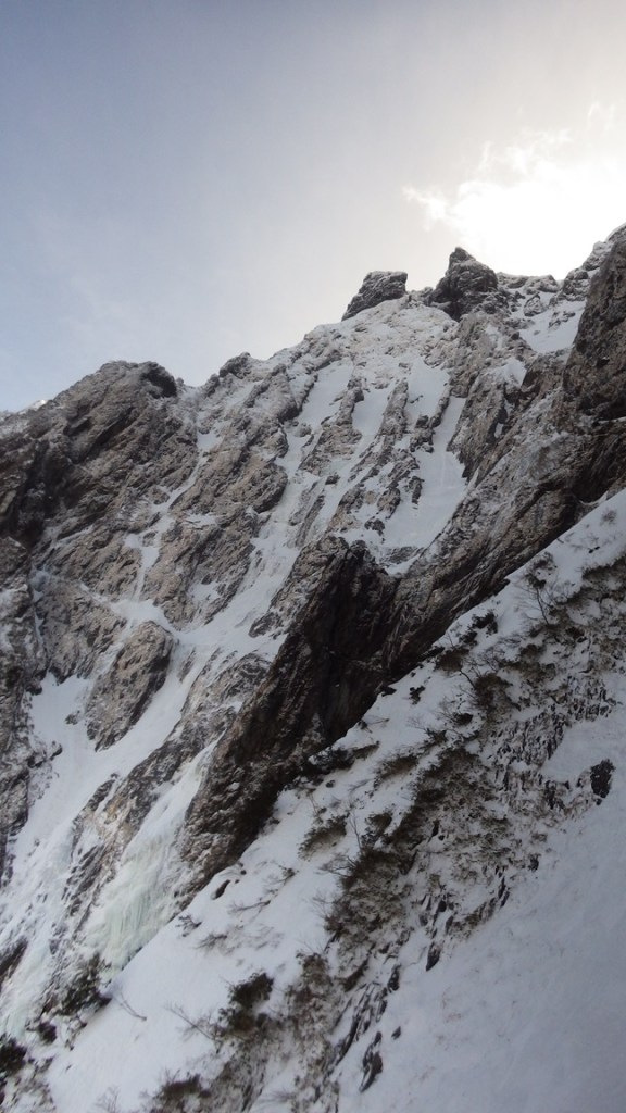 ・無雪期のラインどりの出だしから左に出て傾斜のきついフェースを少し登るところは雪が付いて難しそうに見えました。残置も無く支点も取れないのに厳しいところへは突っ込めないので傾斜も少し緩く灌木もある右のラインを登りました。傾斜のきついところを登り終え左へ移るとかなり傾斜は緩みましたがその先も悪そうに見えました。残置支点が無くボロ氷と雪しかないど真ん中を避けて灌木が少しある左寄りのラインから登りました。