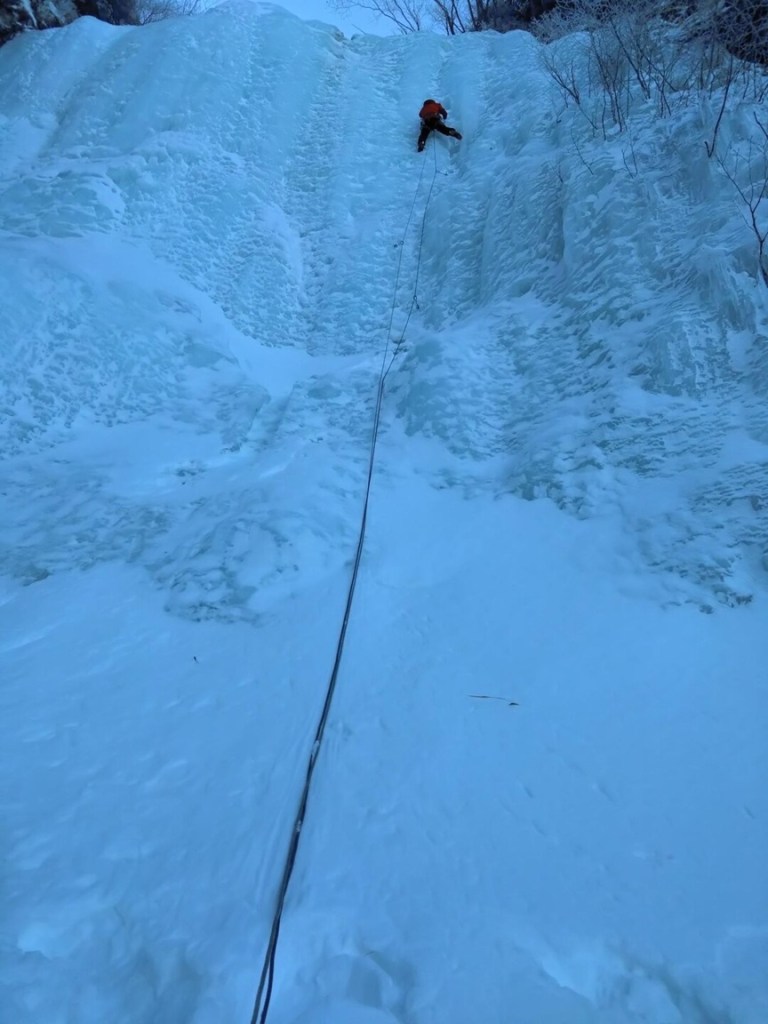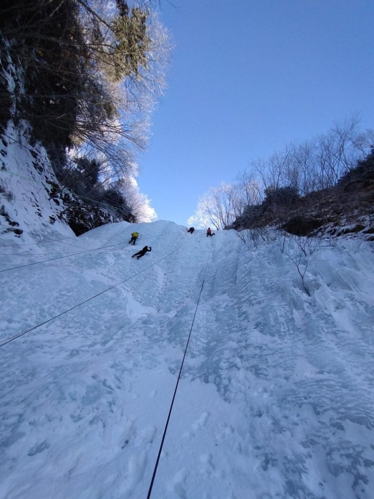 (進藤ま)まだまだアイス不完全燃焼の満さんと八ヶ岳南沢大滝へ行ってきました。今回も混雑を予想して早めにヘッデンスタート♪ 南沢のルートは1人の方のトレースのみ!! 暗いので途中トレースを見失いちょっと迷いましたが何とか無事に大滝への分岐に到着\(^o^)/ しか〰し予想していましたが… やっぱりそこからはノートレース。私が大滝取付きまで頑張って進みました。今回も満さんがリードで登りTRセットしてくれました。私も最初は一応スクリュー打ち込みながらTRで登りましたが… 今シーズンはもうリードしなくてもいいかなって気持ちに・・・なのでその後は2本連続が限界でしたがただ単に登ることを何回かしてアックスの打ち込み、アイゼンの蹴り込みを存分に楽しみました♪ そうこうしていると次第に大滝はTRのロープでスダレ状態の大混雑に。なので12時頃で早々に切り上げ帰りました。