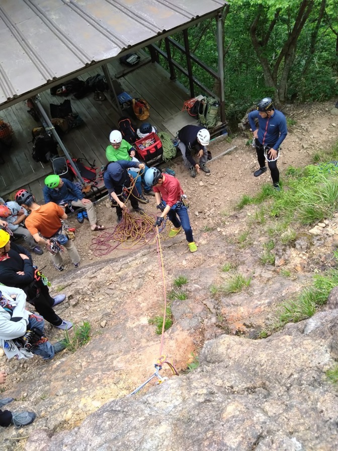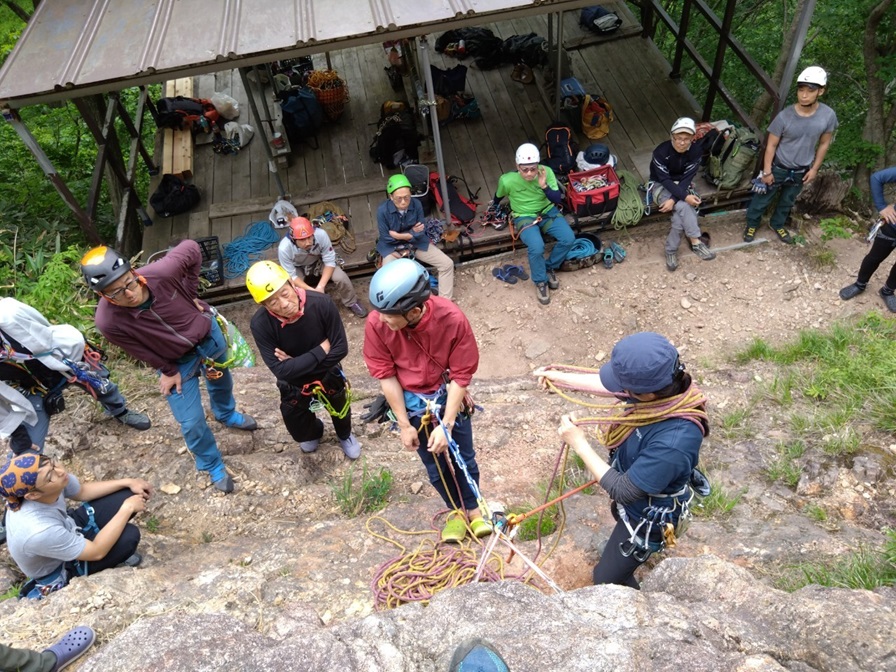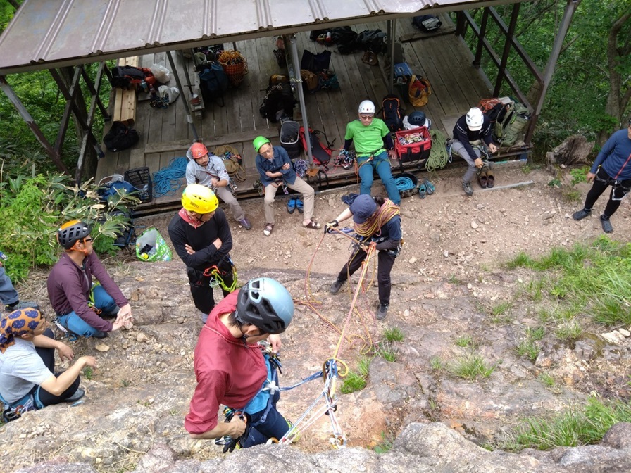 (進藤ま)今回の参加者は17名でした。一番近くで見させていただき良いところはドンドン取り入れていきたいと思います。私もですが皆さんも講習に参加しただけで満足せず考えなくても次の行動が素早く確実に出来るように日々反復練習頑張りましょう。石附さんが東屋で繰り出し式の懸垂下降の手順を何度も何度も一人で練習している姿がとても印象的でした♪