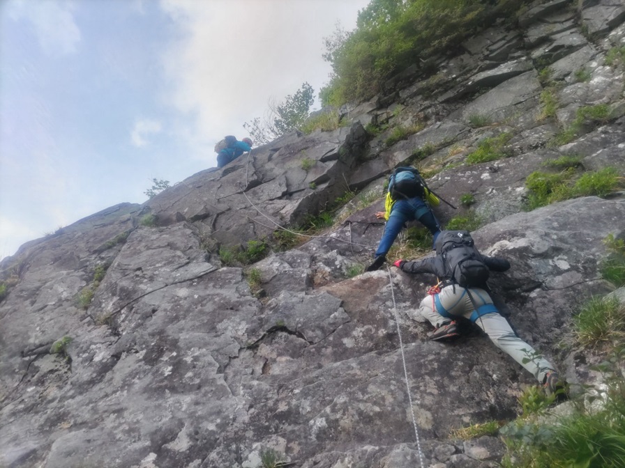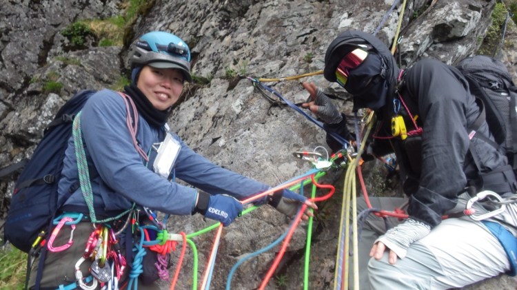 (渡辺)昨年の秋に遊歩道から見ていた所に行くことになるとは自分でも驚きでした!最終ピッチで終了点手前でフォールしてしまい、ホールドは慎重に選ばないと!と反省しました。事前に杉滝で、はるかさんと手順や繰出し懸垂の練習をしていたのでスムーズに行けたと思います。下山後の、お風呂~食事+おみやげ!と大満足の1日でした。ありがとうございました。