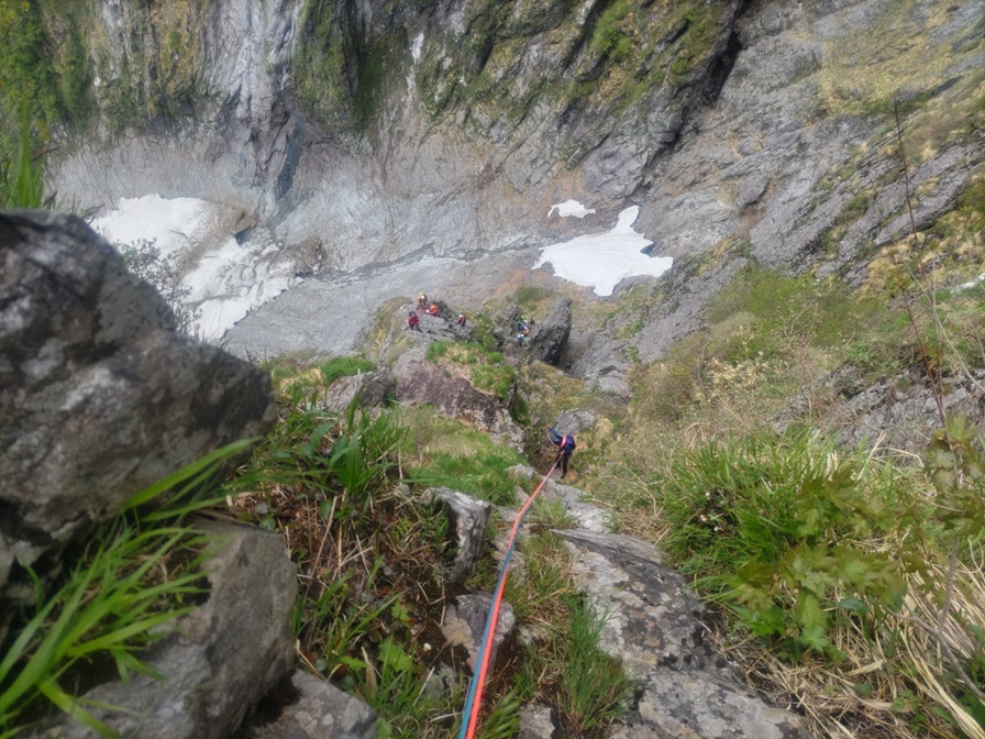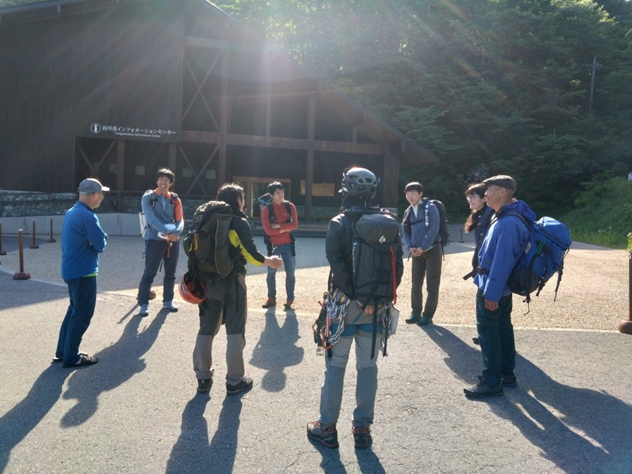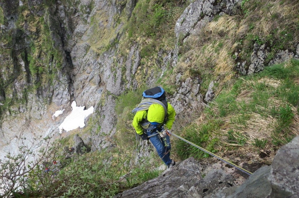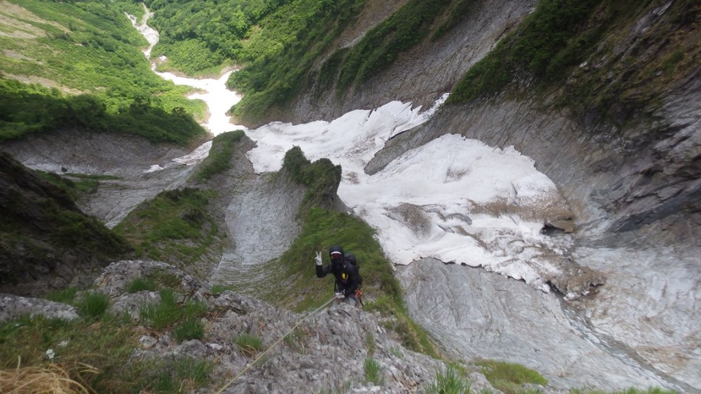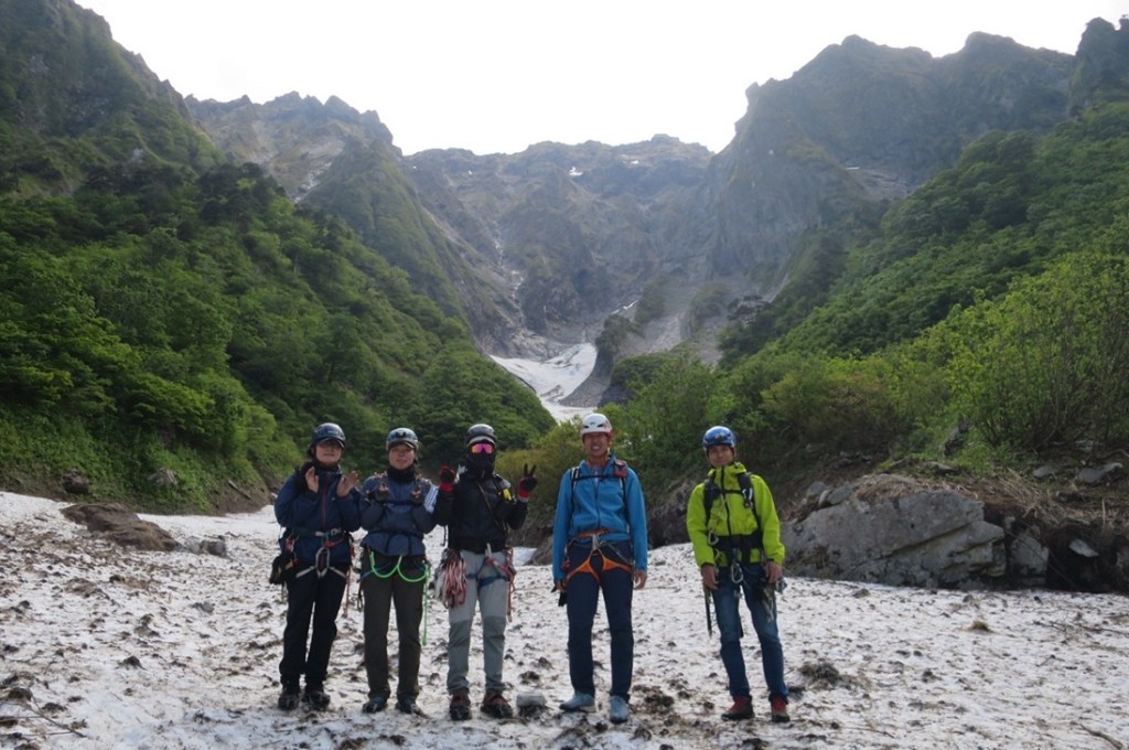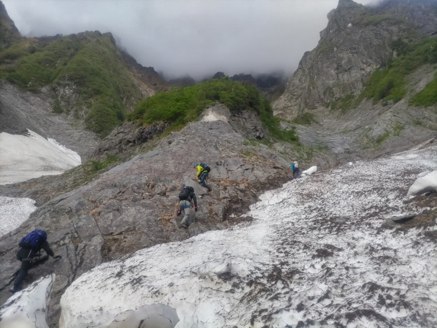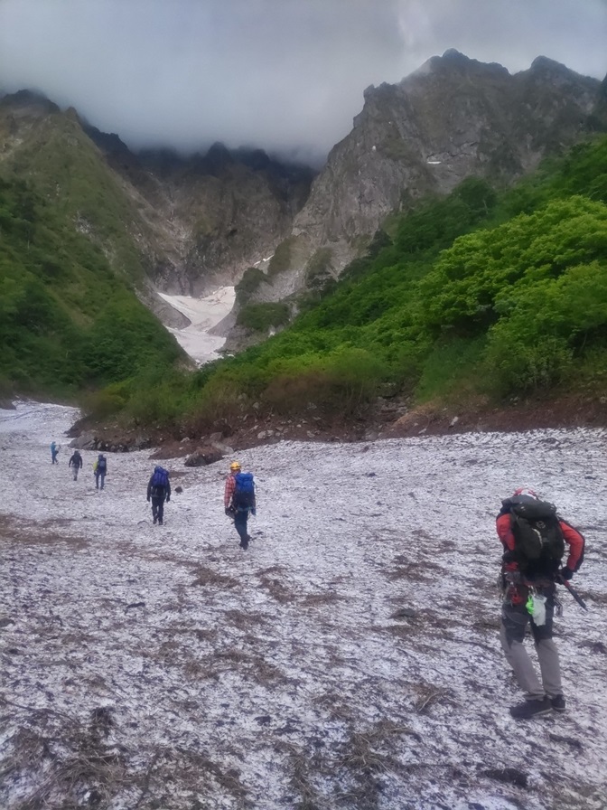 ★ルート:谷川岳インフォメーションセンター駐車場→一ノ倉沢出合→(一ノ倉沢の夏道~雪渓を登る)→テールリッジ基部→(テールリッジを登る)→中央稜取付→(石附班は中央稜1P目を登攀し同ルート懸垂下降、その後同ルート下降で一ノ倉沢出合で南稜組を待つ)→南稜テラス→(南稜を登攀)→南稜登攀終了→(6ルンゼ右俣~南稜を懸垂下降)→南稜テラス→中央稜取付 →(テールリッジを下る)→テールリッジ基部→(一ノ倉沢の雪渓~夏道を下る) →一ノ倉沢出合→谷川岳インフォメーションセンター駐車場