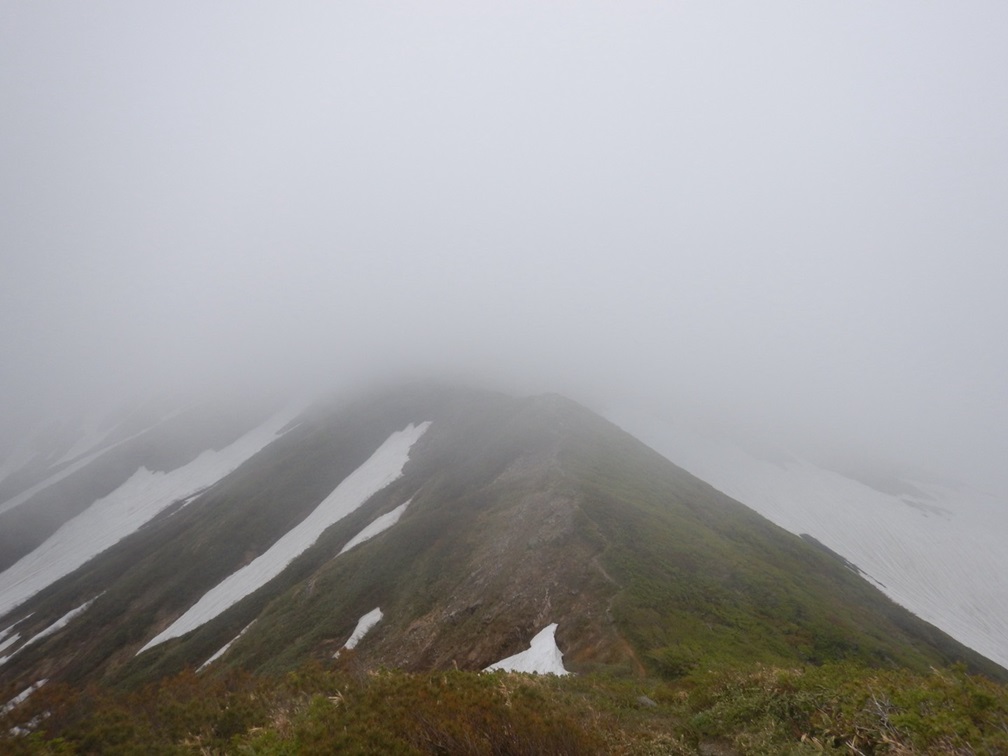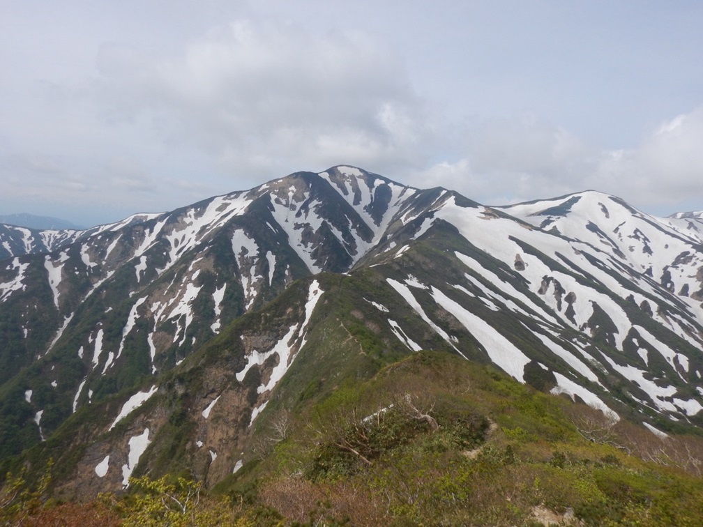 ★感想:日暮沢から周回ルートで大朝日岳に行ってきました。前回、大朝日から西朝日方面の稜線を眺めた時に久しぶりに歩きたいと思い立ち、こちらも久しぶりの竜門避難小屋泊で行って来ました。一日目、天気は予報よりも悪く曇天で風も強く辛い稜線歩きとなりました。低体温のリスクもあり小屋泊に持ってきた防寒着が役立ちました。竜門小屋の水場は小屋まで引水していないので水源地近くで汲みました。ホースを辿っていけば場所は分かると思います。二日目は早朝行動のため雪渓が硬く締まっておりツボ足では緊張した場面がありました。銀玉水は融雪が進み水が出ていました。ぶな峠にて山の恵みをおすそ分けして貰いながら正午過ぎのゆっくり下山となりました。