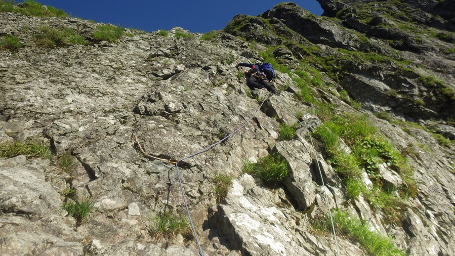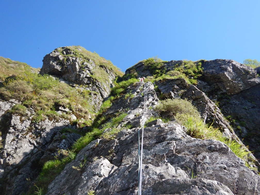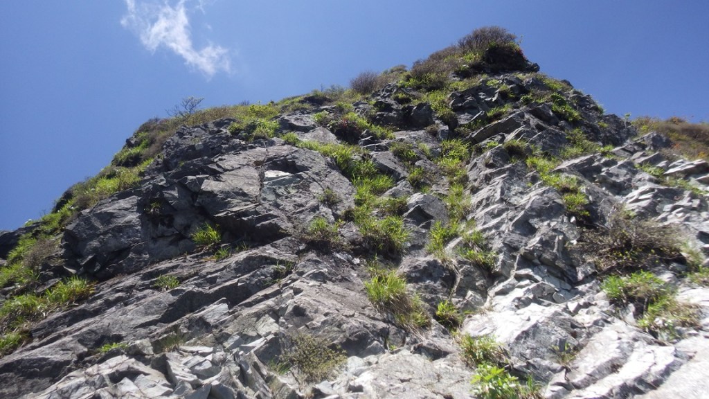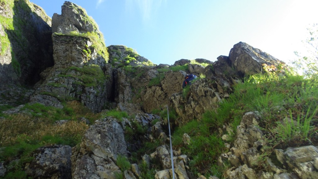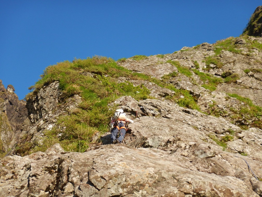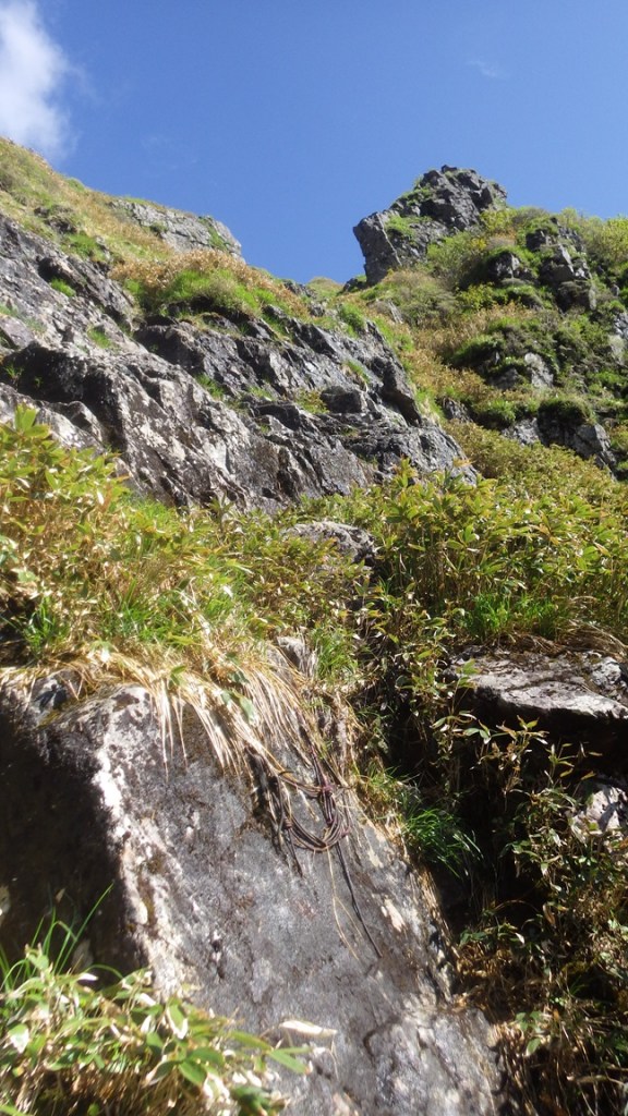・3P目はコンテで草付を登り短い垂壁の基部にあるリングボルトの支点でピッチを切った。