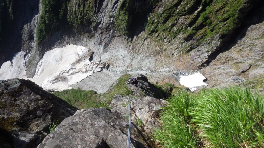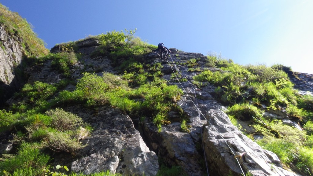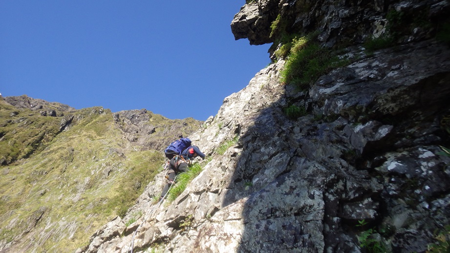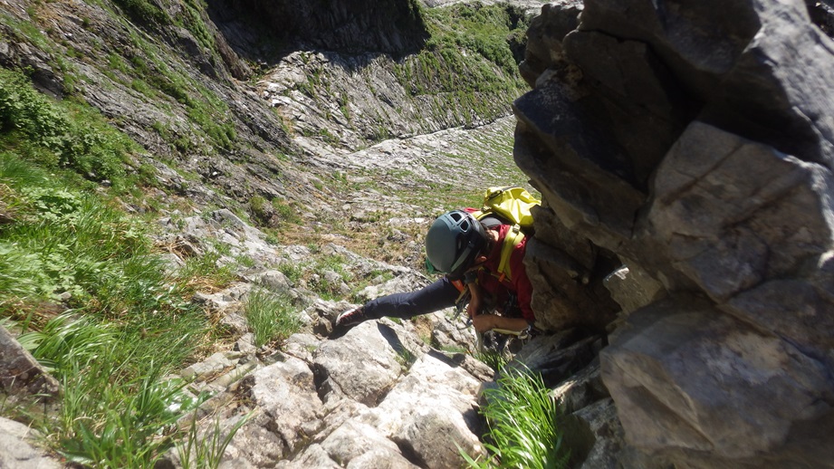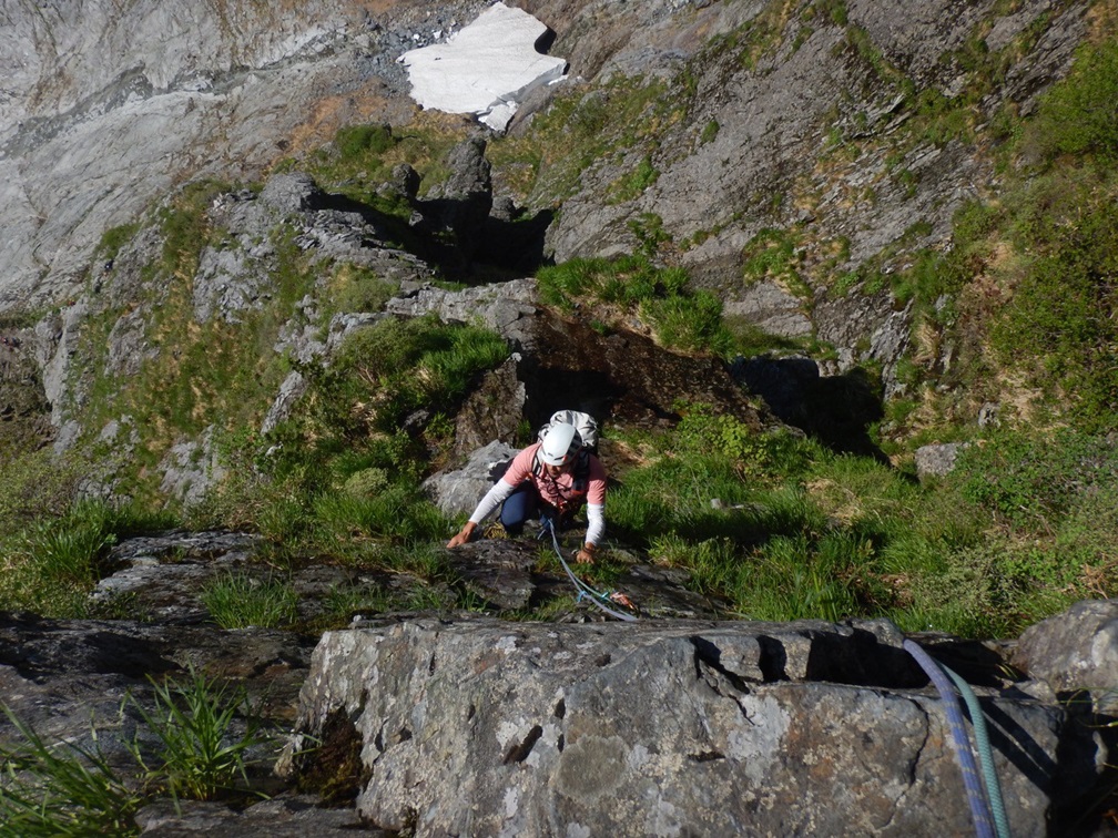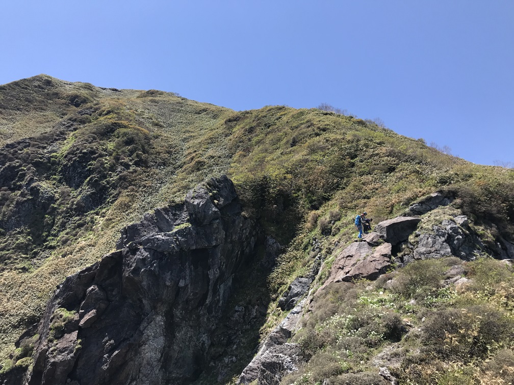 ・3P目はコンテで草付を登り短い垂壁の基部にあるリングボルトの支点でピッチを切った。