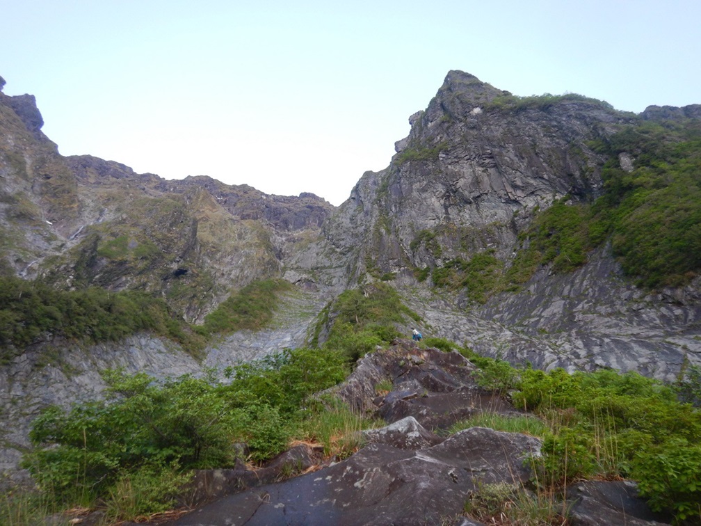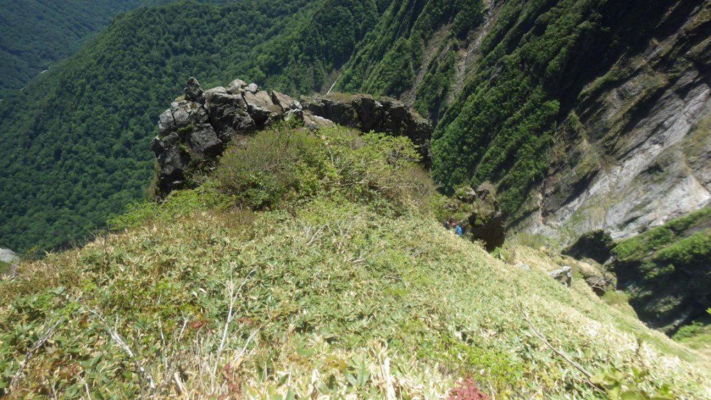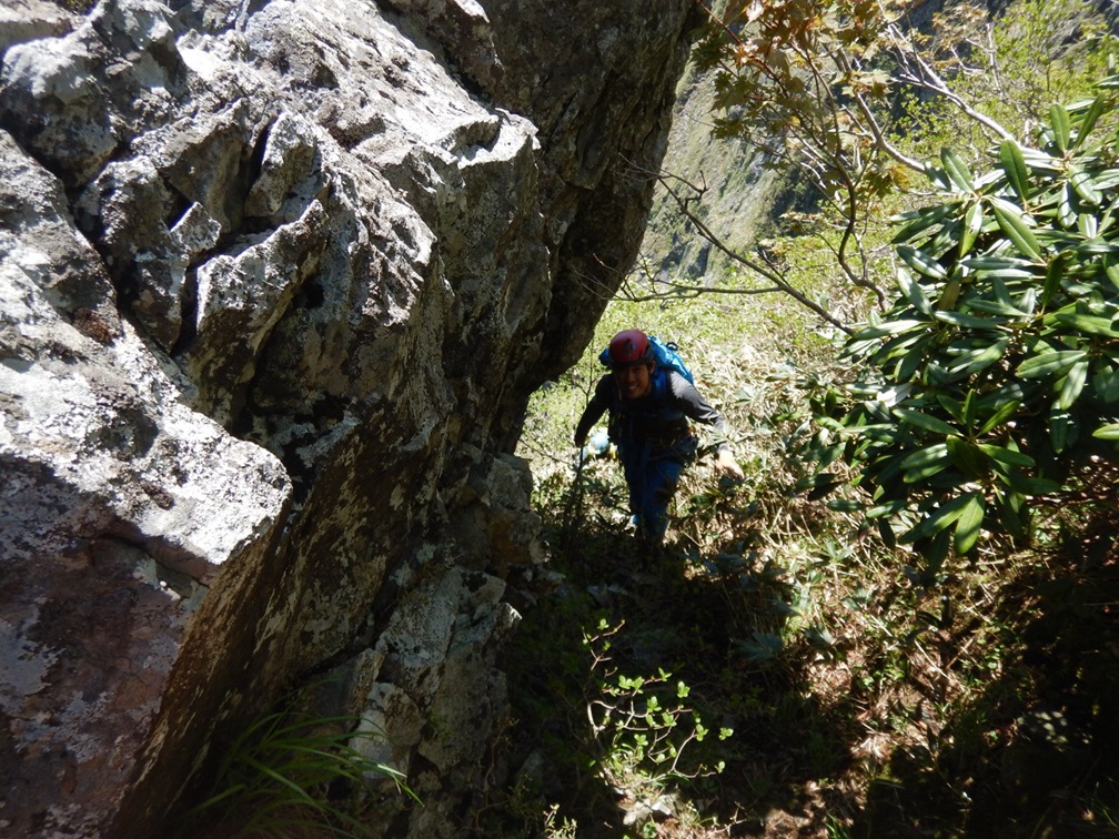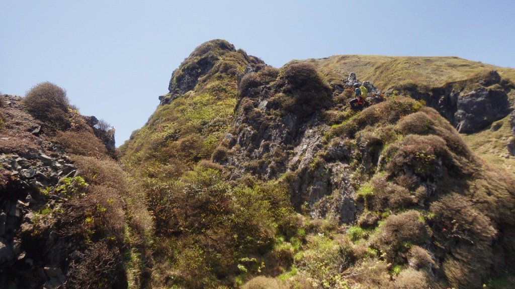・6P終了点の少し上の足場の安定したところでアンザイレン解除してロープを片付ける。そこから後続の岸畑パーティーと一緒に4人で行動。懸垂岩までの登りは岩場(岩はところどころ濡れてましたが乾いた場所を選んで登れました。ここは全部濡れていたら地味に嫌らしいと思います。)をフリーで登り、その後薄い踏み跡のある草付を登っていく。懸垂岩から5ルンゼの頭までは明瞭な踏み跡を登っていく。