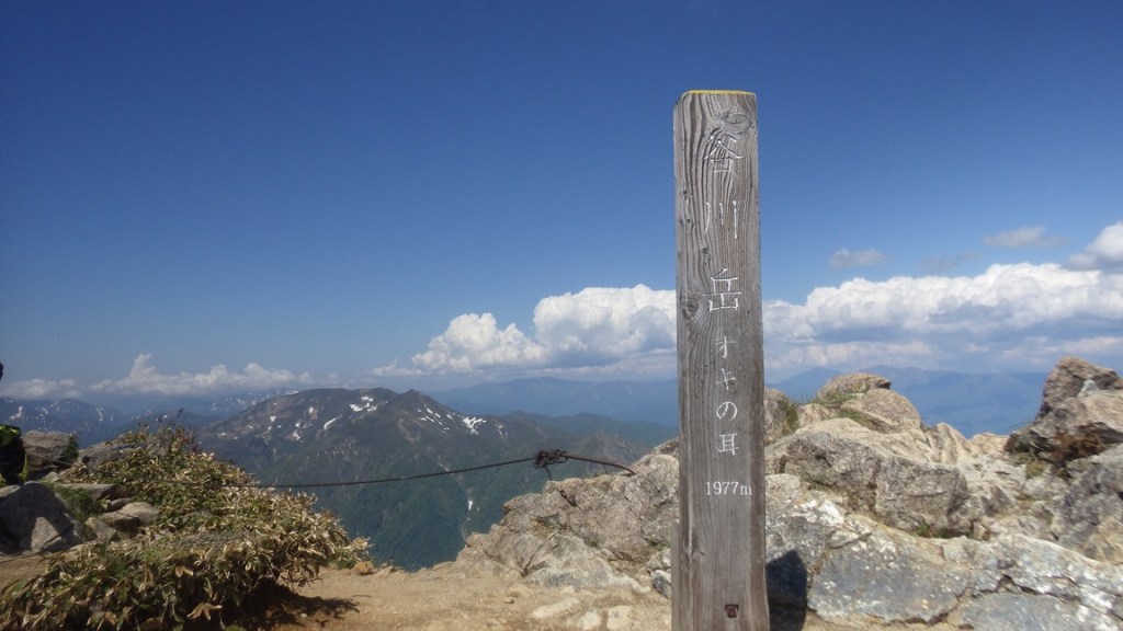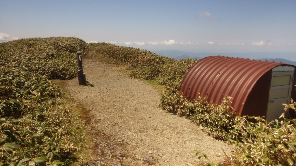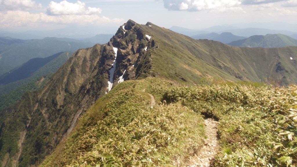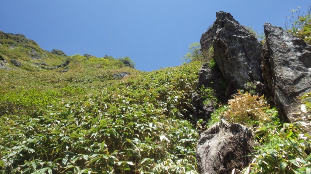 ・5ルンゼの頭を越えてしばらく明瞭な踏み跡を登っていくと最後は薄い踏み跡のハイマツ帯の藪漕ぎをして国境稜線へと出る。