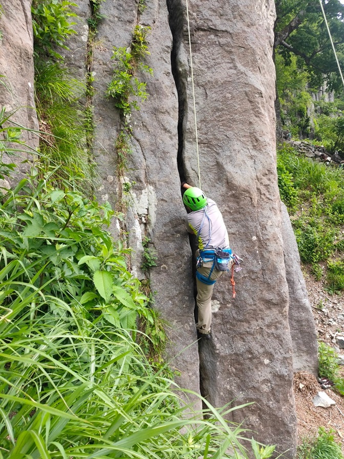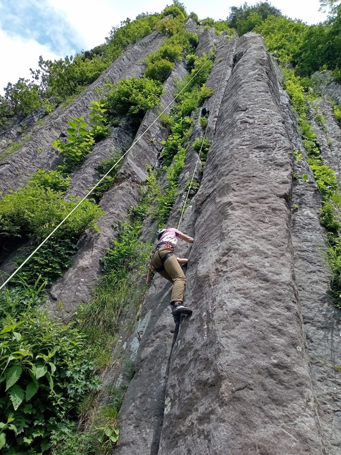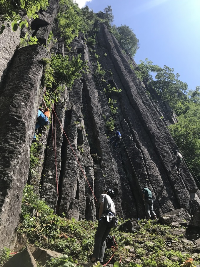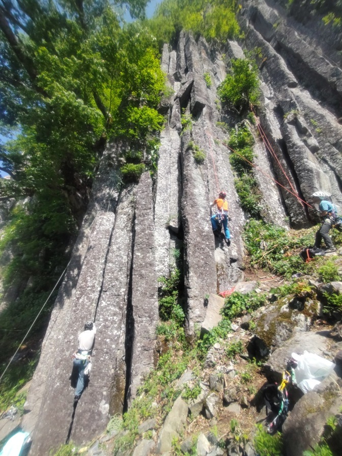 (坂井)前回行った時から大きく開拓され、下地が整備されルートも増え、ルート名も看板が付いていたりで楽しく快適になってました。すごい!登りはゴダイゴ峠に完敗。溝が広い!足痛い!ジャミングも使い方・使いどころを考えられるようなっていきたいです。欅5.10aはルート上に木があり高度感もありで楽しかったです。易しいところでジャミングが決まる感覚に慣れるとフェース?に出るときが少し怖かったりして新鮮でした。