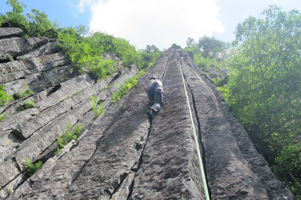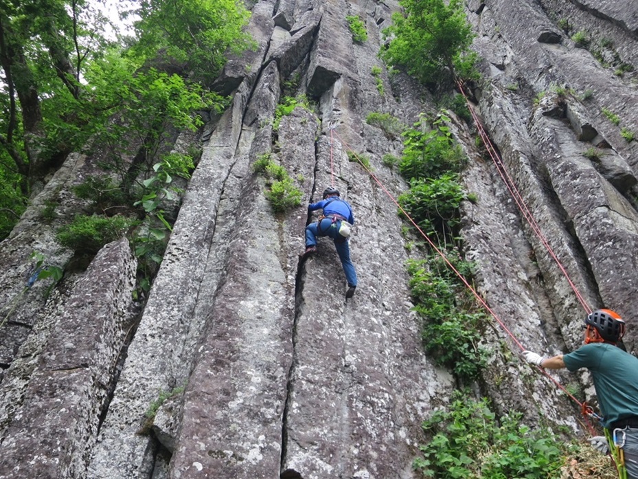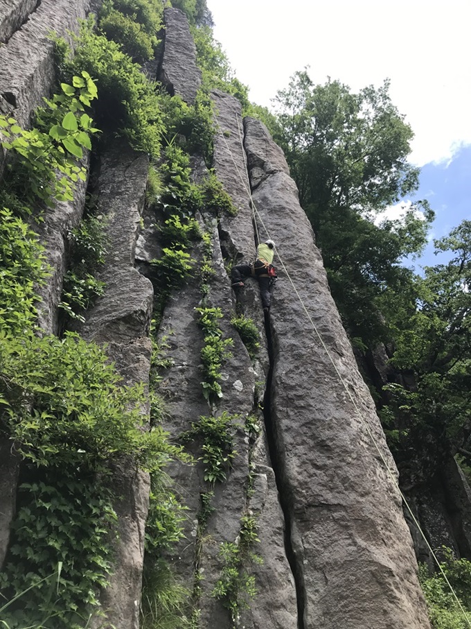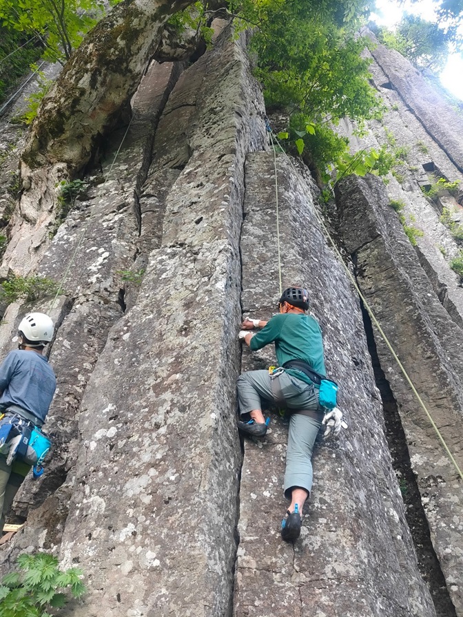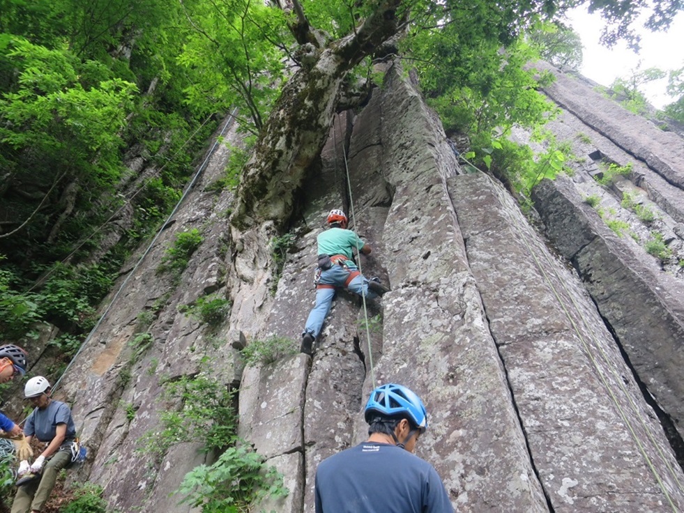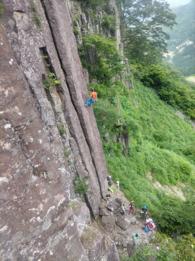 (竹内)布岩は、今年3度目の挑戦になりました。15日~16日の1泊でした。15日は、六根清浄【25m、10b】にリードで挑戦。トップアウト一歩手前で、左に逃げ、岩が剥がれて痛恨の落下、紫カムがなんとか支えてくれました。下にいるにご迷惑をかけました。まだまだ修行が足りません。やはり、布岩は、新潟県のクラック練習の最適の場所と思いました。また羽田さんの手作り料理を堪能できました。涼しくなったらまたみんなでいきましょう。