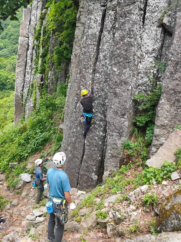 (木村)アルパインクライミングで短いクラックパートは登った程度で本格的な長いルートのクラッククライミングは初体験でした。岩の割れ目に手足をねじ込んで登っていく。その割れ目にプロテクションを掛けていく。ジャミング技術、ナチュプロ技術とクライミングに重要な要素が習得できトラッドクライミングの幅が広がると感じました。講習会だけの参加だけではなく継続して取り組みたいと思います。講習会を企画してくれた方々、前夜のキャンプを手配してくれた方々、トップロープを構築してくれた方々、ルート整備をしてれた方々、に改めて感謝します。私も、自立したクライマーから提供できるクライマーを目指し、先輩方のご厚意に甘んじることなく成長したいと思います。