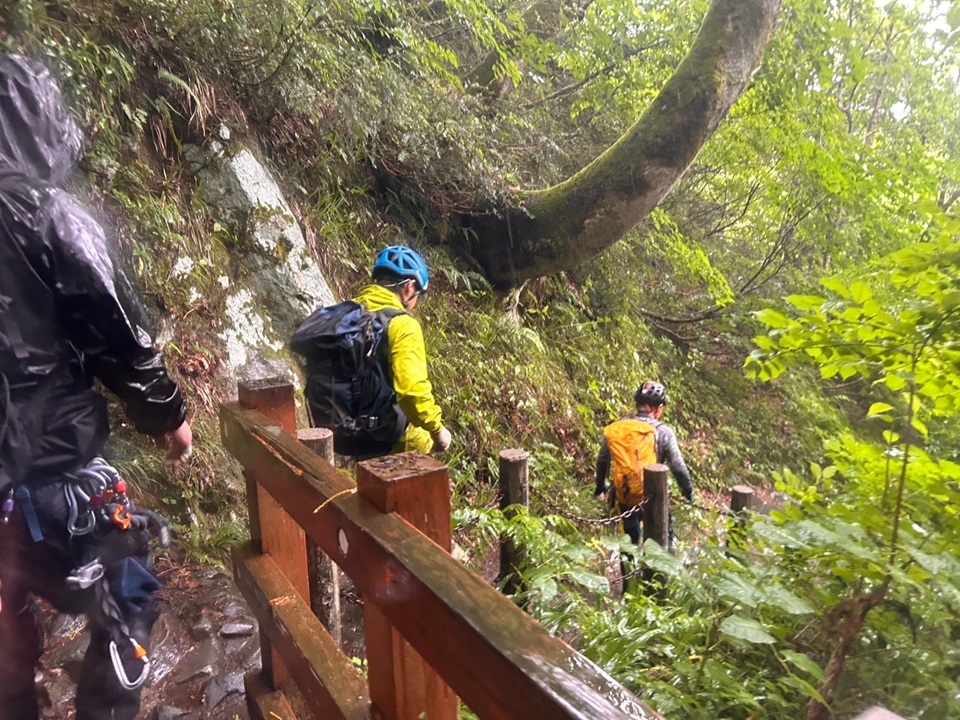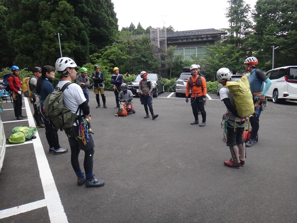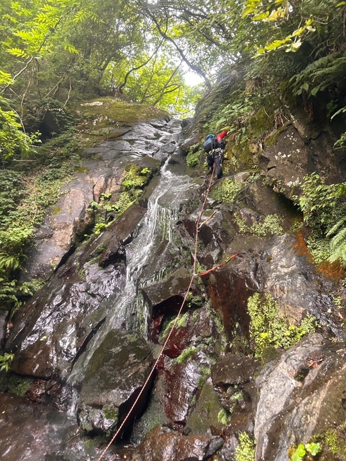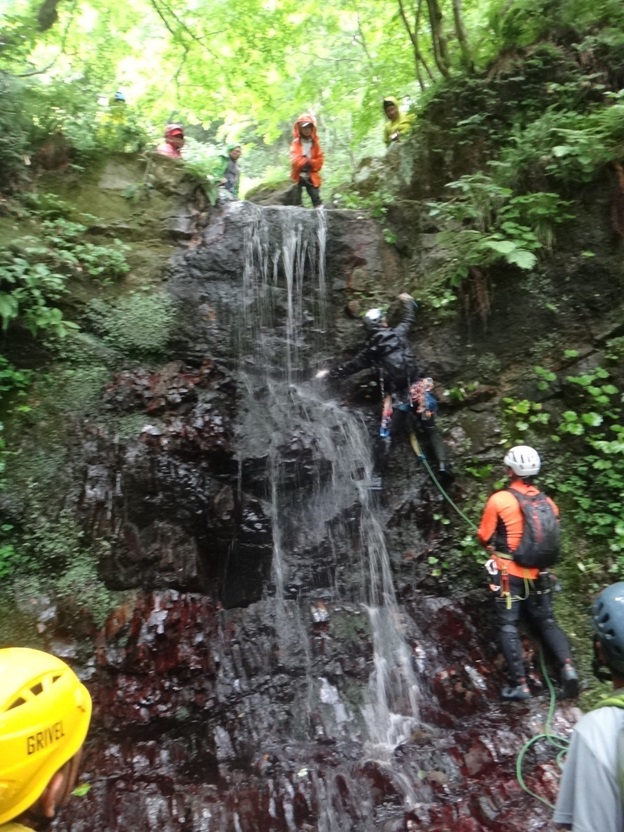(進藤み)15名と参加者が多く3班に分けての行動となり全ての班を見れたわけではありませんが大きな怪我・事故等もなく沢登り初めての方々にも楽しんでもらえた様で良かったです。去年8㍉ロープでホール時タイブロックが効き始めるタイミングが遅いと言う事例があった為、今回は8.5㍉以上のロープだったのでホール時タイブロックが直ぐに効くのが確認できました。カラビナとの相性もあるのでしょうがロープ径との関係が一番なのかなと感じました。それとハーネスのビレイループが縦でなく横の人がいて中間でタイブロックで登って来る時タイブロックが動きづらく大変そうに感じました。あと6月の例会机上講習時、雨具の袖口から水が入り体温が奪われるとの件ですが、やはり今回も袖から水が入ると冷たく寒くなる人が多かったのでその時も言いましたがネオプレーン素材のリストバンドが有効かと感じました。