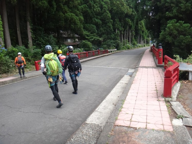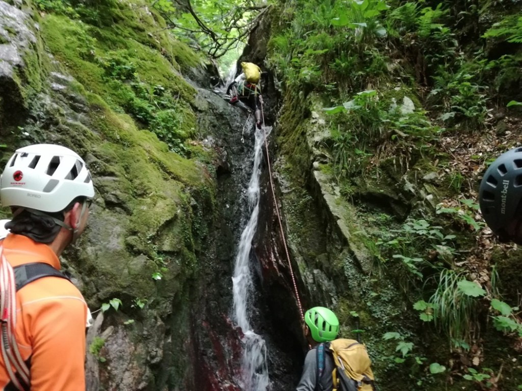 (佐藤)沢登り独特の悪さを思い出しました。リングボルトの滝では、終了点に行ってからの動作を早くしよう早くしようという意識が先行してしまいビレイ解除を言い忘れて、タイムロスがありました。まさに急がば回れでした。その他フィックスの仕方やルーファイ等参考になりました。