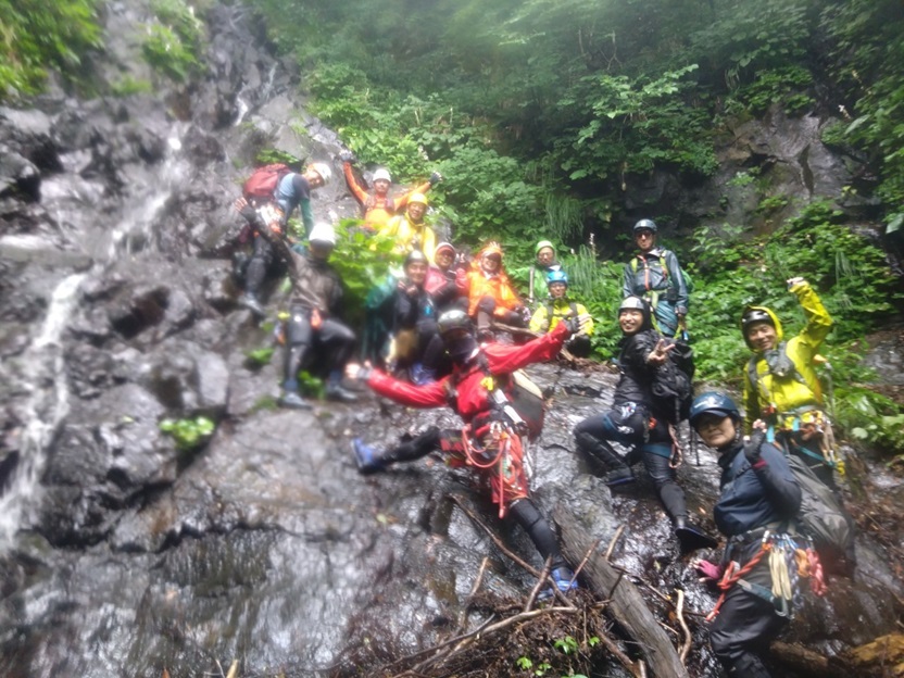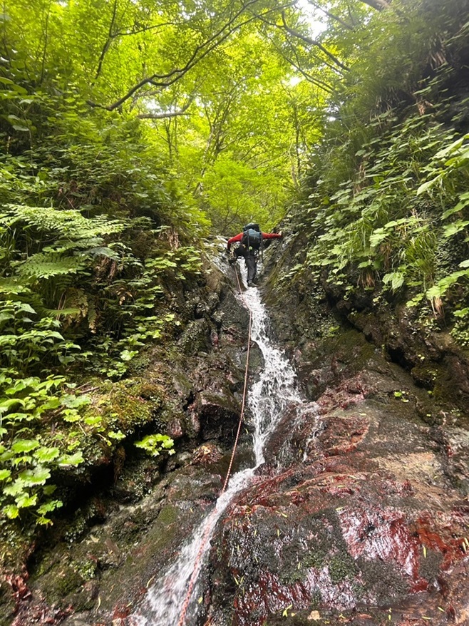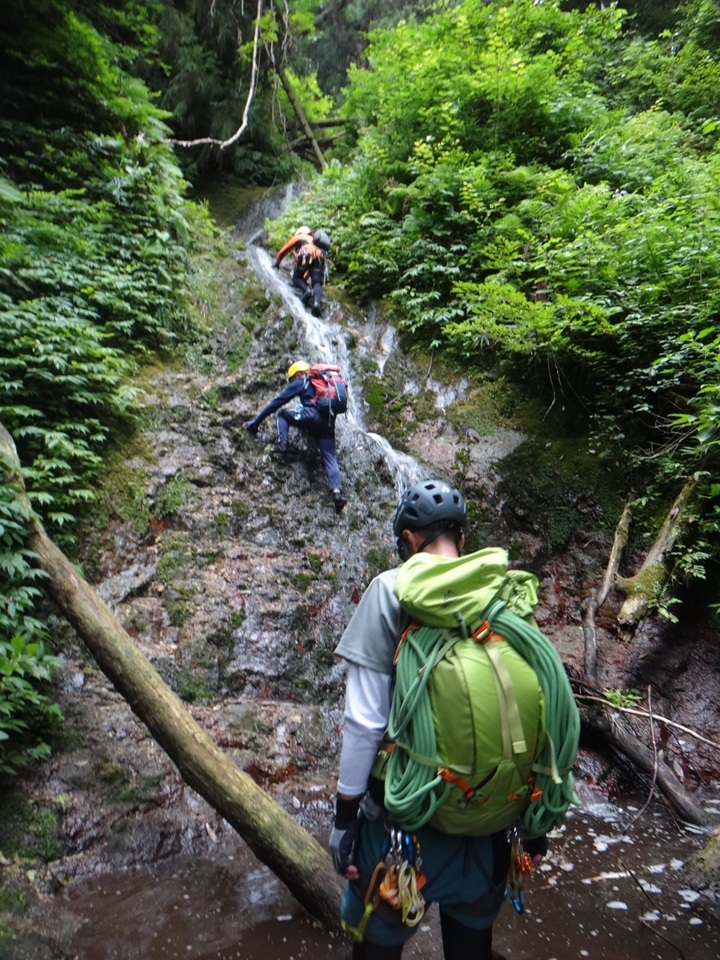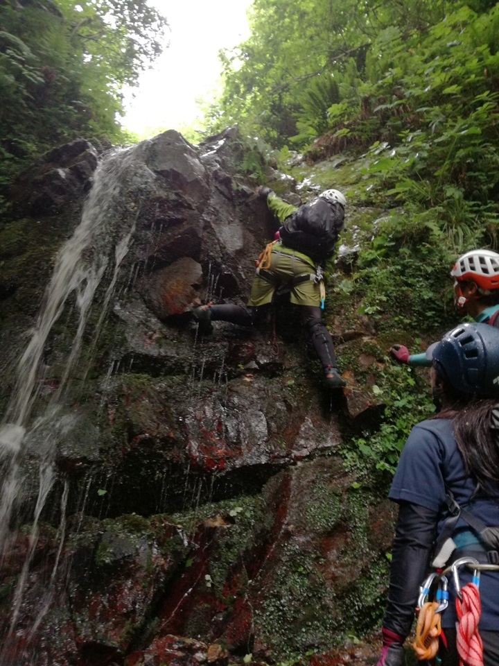 (廣澤)今年初めての沢登りでした。今まで行ったどの沢よりもクライミング要素があり、とても楽しかったです。今回は2つの滝をリードさせていただきました。初めてのリードでしたが、楽しみながら登ることができました。ただ、足を滑らせて2度落ちてしまいました。沢登りでは落ちないように登ること、落ちてはいけないことを肝に銘じます。また、ロープを出さない滝では、かなり緊張しましたが、落ち着いて登ることができ、少しだけ自分の成長を感じました。 みつるさんとまりこさんには、沢山準備をしていただいたり、丁寧に教えていただいたりと今回も大変お世話になりました。ありがとうございました。