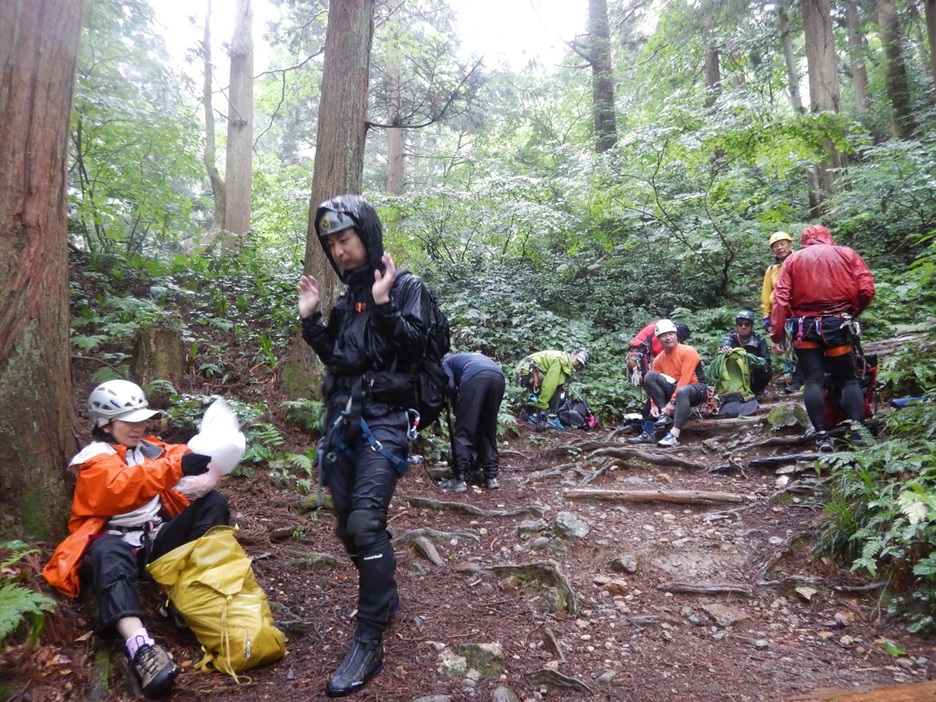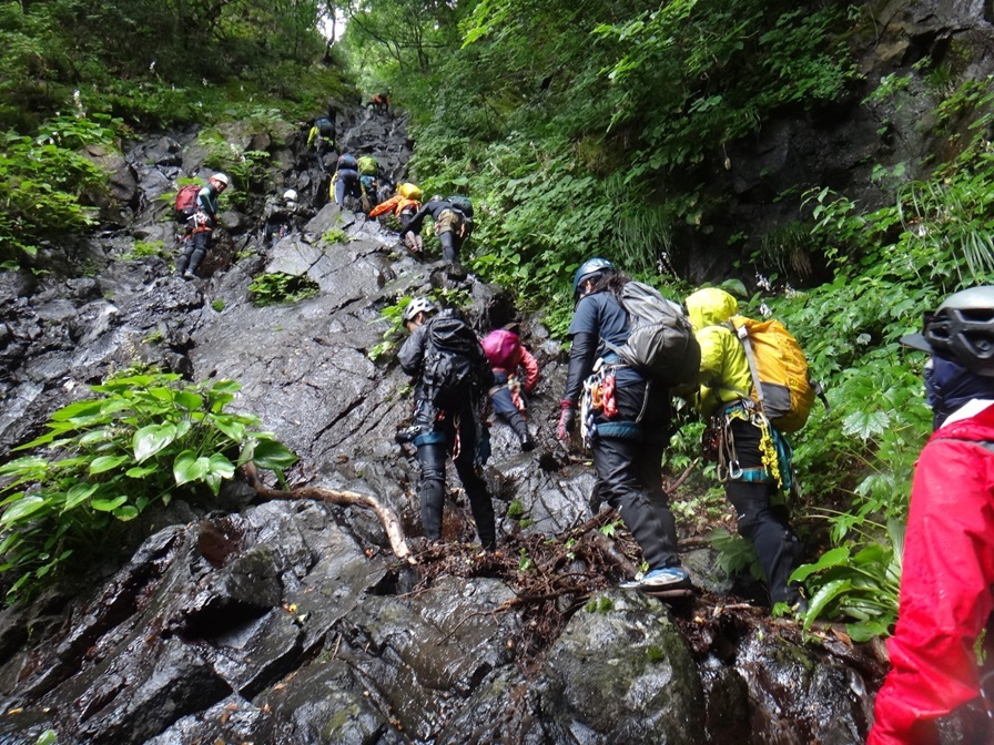 (羽田)年々と入る人が少なくなり、苔、草、倒木で沢の様相が変わってきているように思いました。最初のロープを使わない滝で滑ってしまい、しっかり手、足のスタンスを確認し慎重に登らないと身にしみて実感しました。沢での怪我は、思った以上に大怪我になりやすく、沢がすべての総合力だけに初心を忘れないようにしなければいけないと思いました。