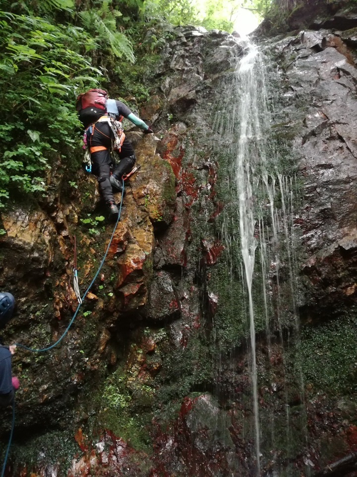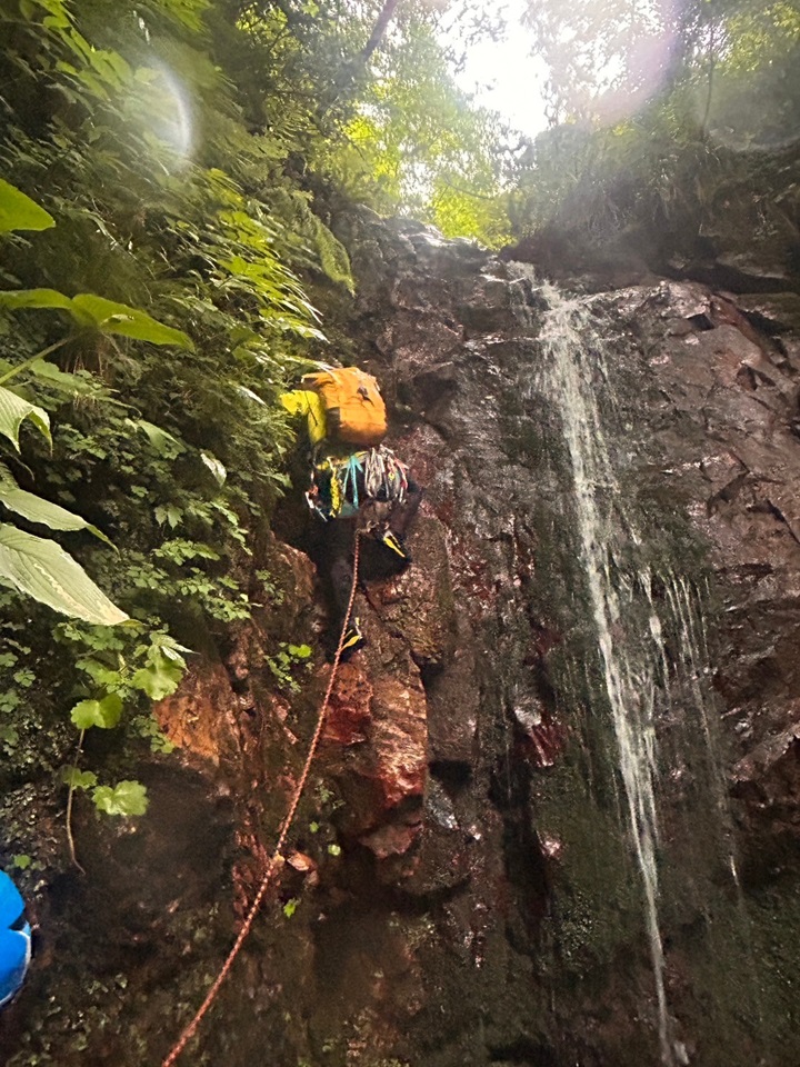 ・滝を登ったところに終了点に使えそうな灌木は無く、残置ハーケンもあるが1つしかない(他に適当なリスもクラックも無い)ので肩絡みビレイ。小さい滝をもう1段登ると終了点に使える灌木があるのでそこまで登るのもあり。
