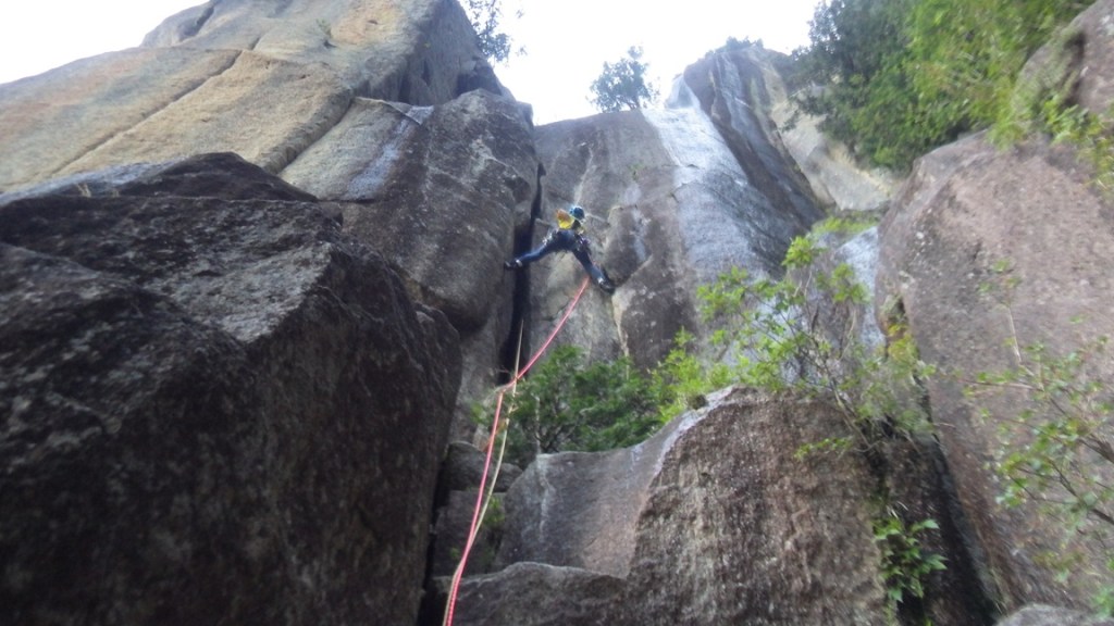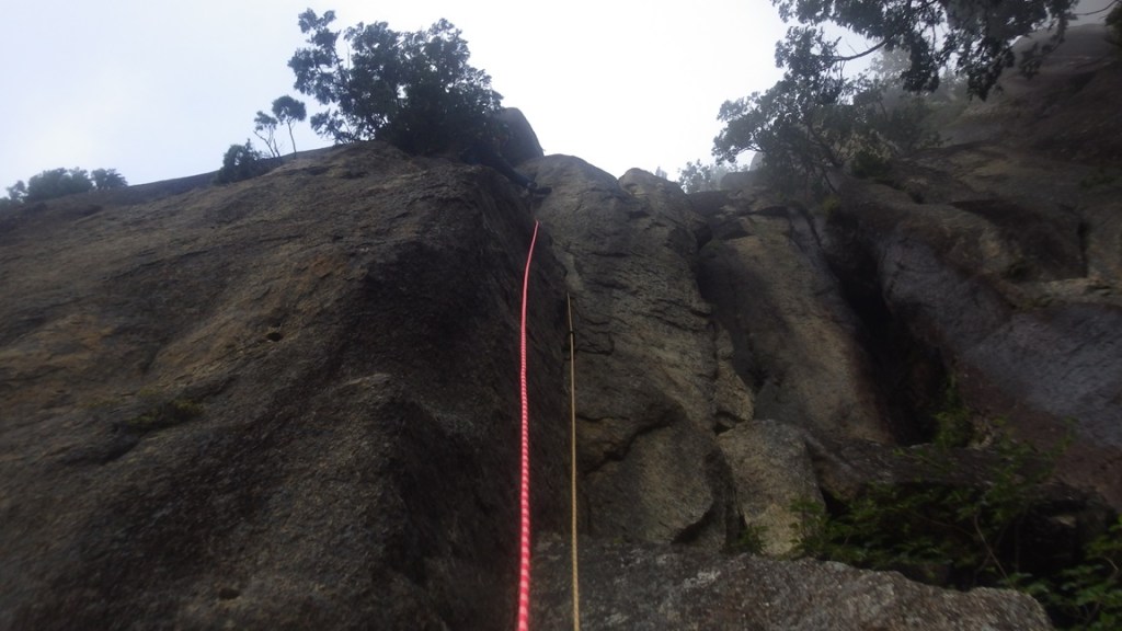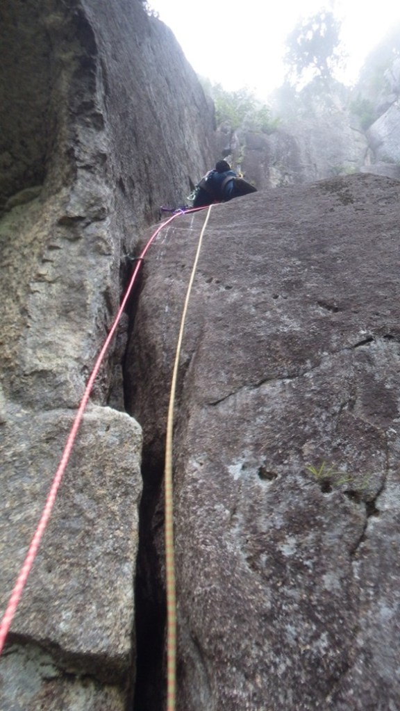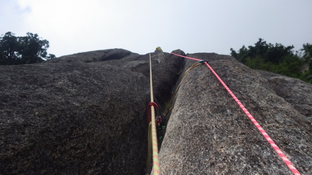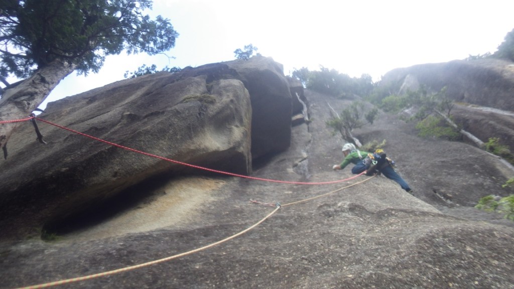 ・出だしのワイドは濡れて悪かった。コーナーフィンガークラックを使いながら濡れたスラブを登ったが悪かったのでA0で突破。