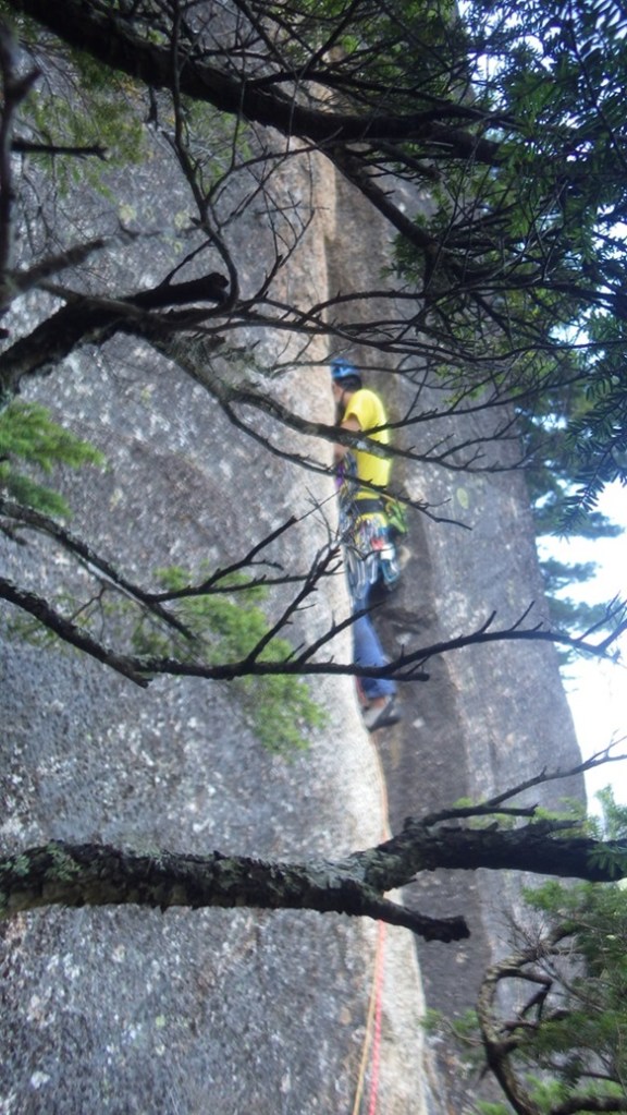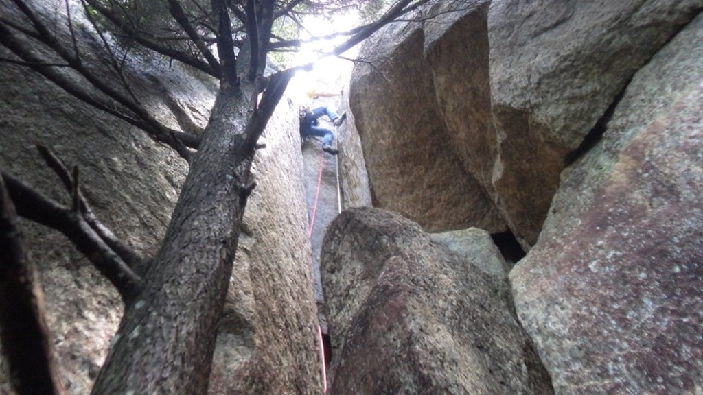 ・次のピッチ(トポ5P目 左にトラバースしてから岩の間を登る)は一応リードのビレイはしたがノープロで登れたのでフォーローはビレイなし。