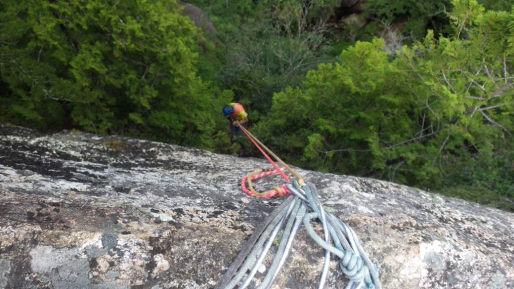 ・一応ロープを結んだままノープロで瑞牆山山頂の方へ歩いて行く。ケルンもあって迷わず懸垂下降支点を発見してそこから50mダブルロープ2本で1回懸垂下降して地面へ。