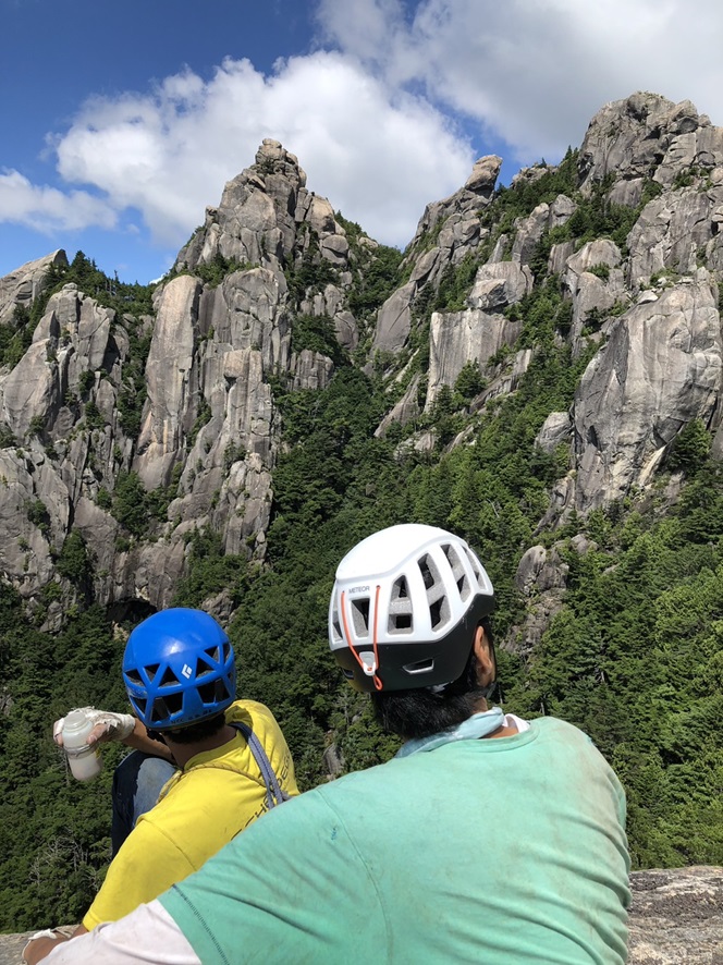 (山宮)11台のクラックは今の自分にとってオーバーグレードでフォローでも登れませんでした。(A1で突破。)ワイドもA0ありで苦戦しました。(今年何回かワイドを登ってなければもっと苦戦したかも・・・)オールリードしてくれた佐藤さんは2P目のフィンガークラックで1回フォール(本人曰く『パンプした』)しましたがその他は全てOS。レベルが違いました。『また来年挑戦しましょう!』と佐藤さんから言われましたが・・・11台のクラックはフォローで登れるよう、ワイドのピッチはリードで登れるようトレーニングしたいと思います!