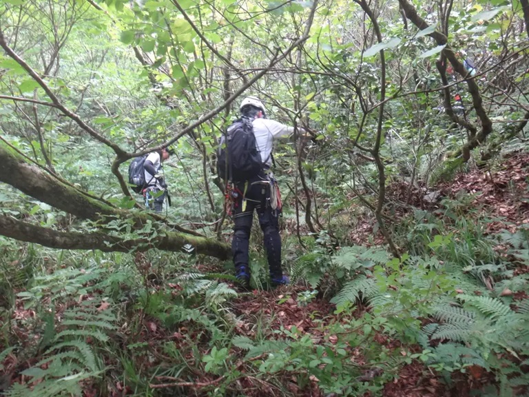 (土田忍)小倉沢は、鬱蒼とした雰囲気の弥彦より、少し景色の開けた水量の多いダイナミックな沢でクライミングも存分に楽しむことが出来ました。今回はロープを出す箇所では落ちない、ごぼうをしないを目標に登りなんとかクリアしましたが、最後の高巻きで立ったままの姿勢で2m程滑り落ちてしまいました。渋滞気味で前を登る人に近すぎたので、距離を取ろうと少し下がったときに崩れやすい土の上を滑った感じです。何でもない箇所(といってもこの高巻きは厳しくて自分にとっては今日イチの核心でした)で良く事故が起きると思うので、特にそういうパートでは気を引き締めて注意したいと思います。