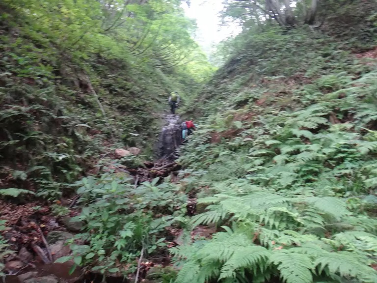・支沢は水が無くなるまで詰めその後傾斜が強くなったら右へトラバース気味に藪漕ぎ数分で登山道に合流します。(そのまま傾斜が強くなる支沢を詰めると四~五ノ峰の合流部より標高の高いところで登山道に合流します。)