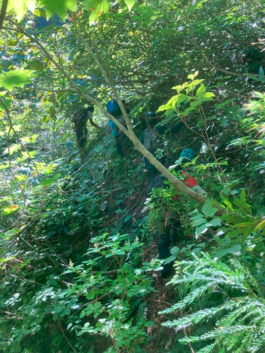 (進藤ま)今回も12名と大人数でした。私は割と最後尾にいましたが高巻きとかは皆が滑ったりした後とかで更に足場が悪くなり怖かったです。しかも最後って誰も助けてくれる人がいなので登れなかったらどうしよーーってドキドキでした。今回私は最後の詰めを前回(2021年に行った時)同様に四ノ峰と五ノ峰の間の登山道に出れるように皆を誘導する大事なナビ係りでした。間違って最後の詰めを1時間も藪漕ぎしないように分岐ではしっかりと道案内し無事に数分の藪漕ぎで登山道合流出来た時は本当に安心しました。全体的に見て皆さんスムーズに登れていて厳しい高巻きもそつなくこなしている様でしたが、皆が安全に楽しんでいる裏では全員に気を配り、しっかりとフォローしてくれる存在がいる事を認識すると共に次回はフォローする側へと成長し次へ次へとに繋げていって欲しいと思いました。それにはただ単に後ろから着いていくのではなく滝を見てこの滝は登れるのか登れないのか?登れるならどのラインなら登れるのか?登れずに高巻きするならどこから登って沢に復帰するにはどこから下降したら安全なのか?という目を養う為にも常に考えながら遡行して欲しいと思いました。(偉そうに書いてますが私も頑張らないとです!)あと満さんも書いていましたが自分で危険だな(触った岩が動く、木が抜けそう、足元が滑りやすい、崩れそう等々)と感じた事や前の人からの伝達事項は必ず後続の人達へ確実に伝えて欲しいと思いました。辛そうにしている人をサポートするのも大事なことです!!そういった行動が無事故へと繋がります。暑い日の沢登りはとても気持ち良く大勢で行けばワイワイと楽しいですが沢登りは本当に危険がいっぱいなので事故や怪我の無いように皆さんがフォローしあい楽しい山行にしていきたいですね♪そうそう今回私はラバーにしましたが私的にはフェルトが良いと思いました♪