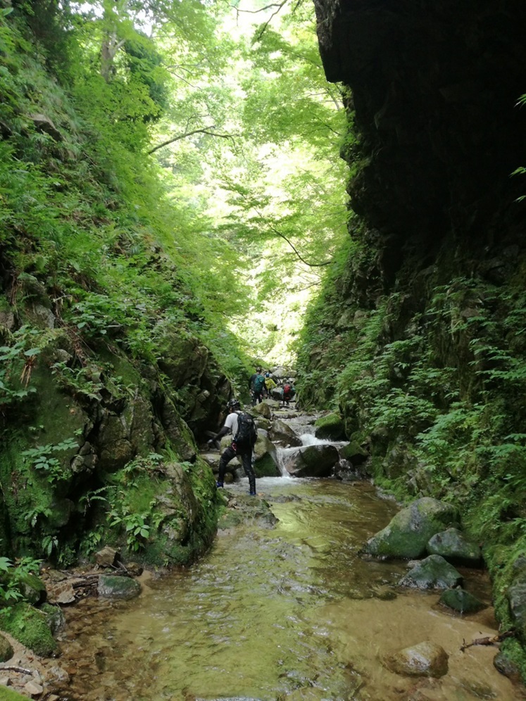 (坂井)去年の米子沢からほぼ1年ぶり2回目の沢登りとなりました。米子沢とは見た目から違った沢っぽさにはしゃぎすぎて、序盤で体力を消耗しすぎました。沢沿いは思ったよりも涼しく、後半はなるべく濡れないようにする羽目になりました。足のつかないところでお助けロープを使わないでいたら流れに逆らえず登れなかったり、足を滑らして2回落ちたのが反省点です。ぬめるところは慎重に判断せねば…。会山行だったので、リードしてもらって見守ってもらってで楽しい思いだけをさせてもらいました。天気も晴れてとても楽しい山行でした!今後も経験を積んで沢登りに慣れていきたいです。