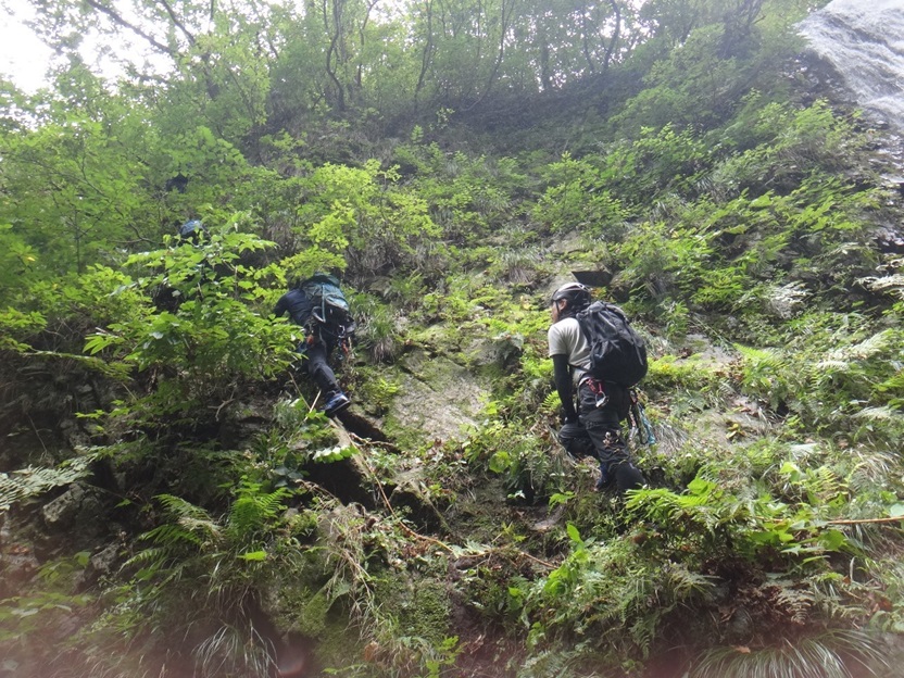 ・西小倉沢の12m滝は左壁から高巻きました(念の為、お助け的にロープをフィックスしました。)が右のルンゼからの高巻きが簡単かどうか偵察がてら進藤みと山宮が登ってみた結果、左から高巻くより簡単だし安全でした。