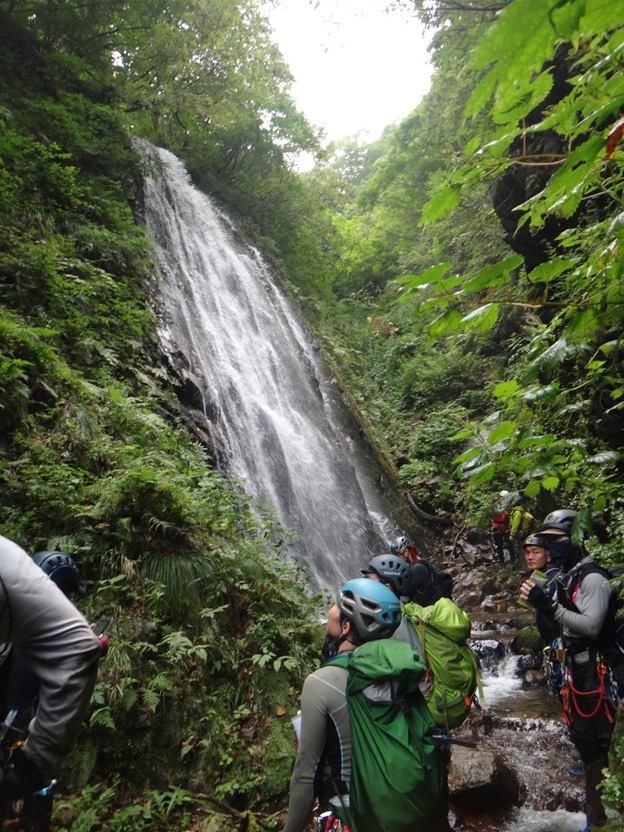 (進藤み)今回は水遊びの前川大滝沢のつもりでしたが天気が…それで前川よりグレードが少し高くなりますが沢の技術力向上と思い西小倉沢にしました。皆さんの感想を見て楽しんでもらえた様なので良かったです。メインの三十三間滝は前衛を含め事前の打合せ通り時間を掛けずに12名が安全に登り終えられるシステムで行いました。しかしそれでもこの区間だけで約2時間掛かりました。リード者はともかく、それ以外は安全は大前提ですがもう少しスピードアップが必要だと見ていて感じました。ここからはお願いになるのかな〜?小滝等でチャレンジしていれば別ですが人数が多い場合は苦戦している人が居たら足を押さえる、体を押してあげる、肩を貸す等積極的にサポートしてくれると有り難いです。それと高巻いている時に多いと思いますが抜けそうな草木、動く岩などホールド・スタンスに危険が感じられた時は次に通るメンバーに状況を伝える事等とても大事なのでよろしくお願いします。最後に皆さん分かっていると思いますが沢登りは水遊びくらいに感じがちですが、ほぼフリーで濡れた岩や泥壁を幾つも越えて行く様なものなので簡単な所でも一歩間違えば大怪我です。残念ですが今回も足を15針縫うという大怪我が起きてしまいました。自分もそうですが沢だとはしゃぎ過ぎる所があるので沢登りもクライミングの一つと思い総合力を上げていきたいと感じました。ですがフリークライミングは落ちて強くなる、沢は絶対に落ちてはいけないのが前提です。今週の例会に参加出来ない人も多いと思うので長文となりましたが、ここ最近の沢登りでリーダーをして感じた事でした。