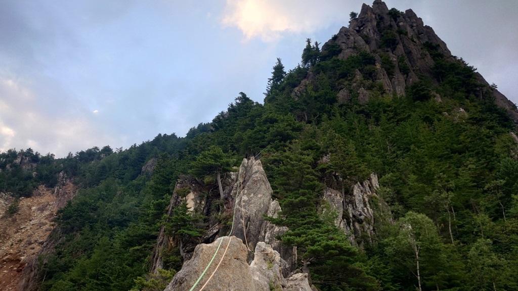 烏帽子左稜線追伸。宮崎さんの感想の通り。竹内が最終ピッチ手前クラック&チムニー取付まで登ったら突然の雷鳴、豪雨。私は行きたい気持ちとクラックは濡れていなかったので登攀が安全、行こうと判断しました。しかし宮崎さんから雨で厳しいとのコール、羽田&荒木組も辞めたいとの意見があったので岩にシュリンゲ、カラビナかけて【捨てて】宮崎を降ろして私も懸垂下降。しかし長いピッチ【段差あり】でロープ2本がスタックして回収出来ず。荒木さんが自分が行きますと手際良く登り返し回収してもらいました。次に後続が登れない場合【佐藤氏に竹内がリクエスト】のフィクスロープの回収をしてもらいました。ロープ3本回収。本当に荒木の判断、行動に感謝します。