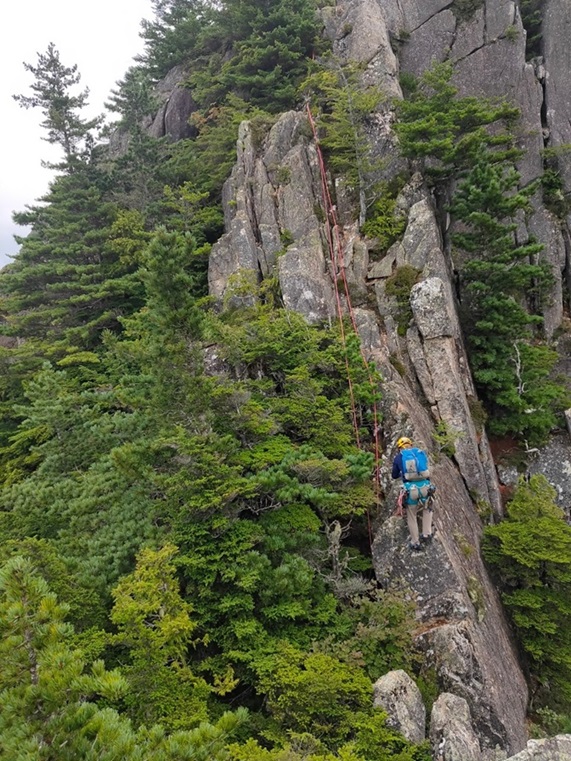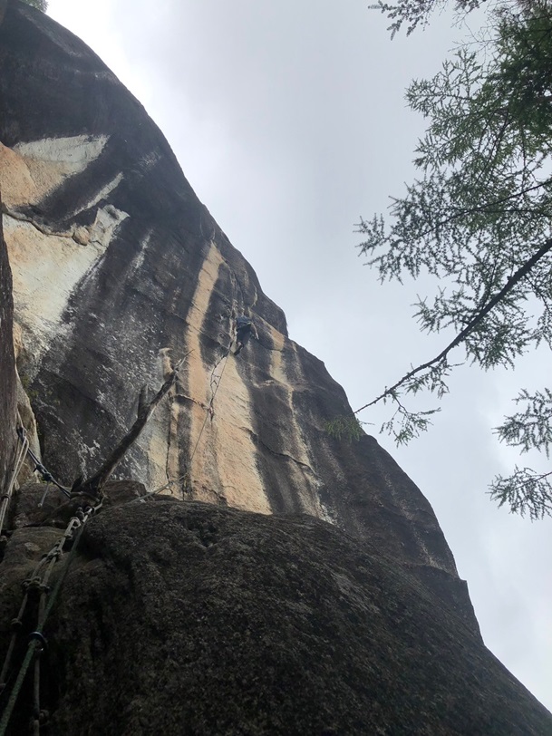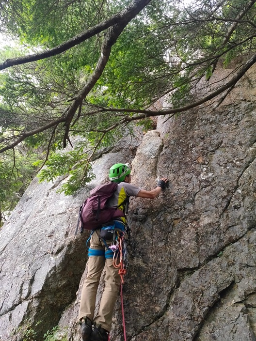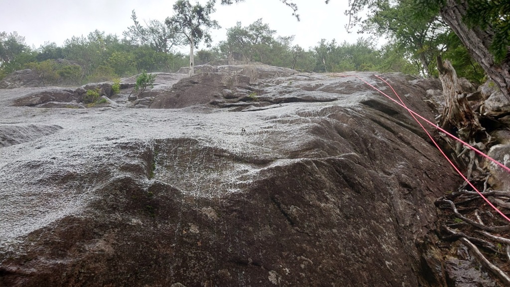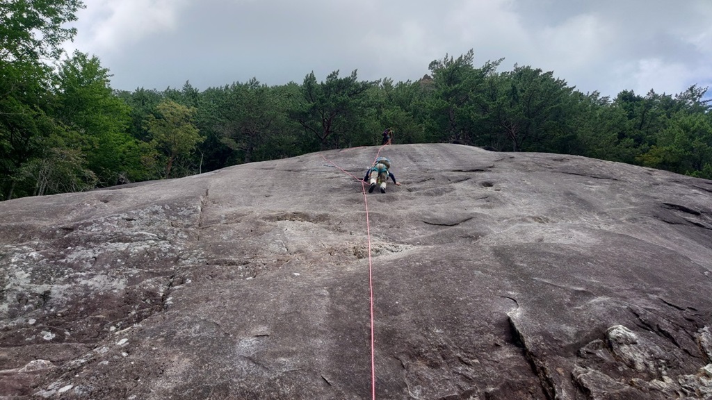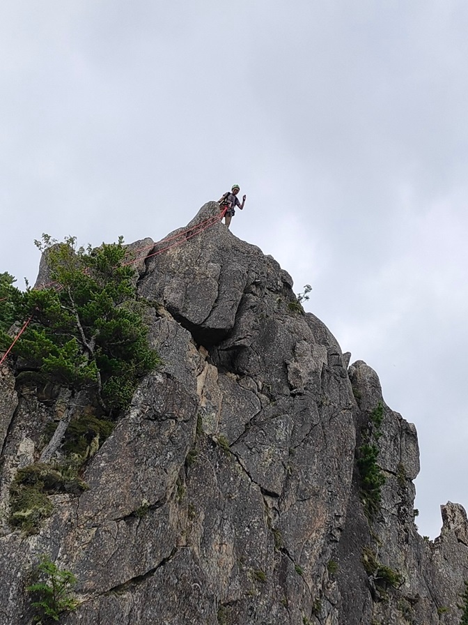 (竹内)13日ガマルート、2ピッチまでの核心部は越えましたが雨で下山しました。スラブは厳しかったです。テンションする人もいました。14日は烏帽子左稜線、am2時佐藤さんに起こされて取付。土田さんのYAMAPナビに助けられて。17ピッチまで行きましたが雷、雨で最後のクラックはやめて下山しました。佐藤、土田組は早々にクラック登って下山、完登。ピッチ数の長さ、クラック、ルートファインディング、懸垂ありで中級か?とにかく充実感のあるクライミングでした。その分疲れました。