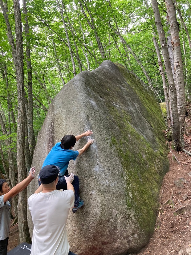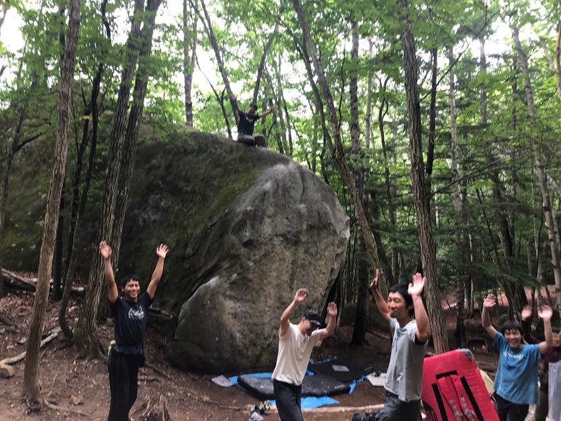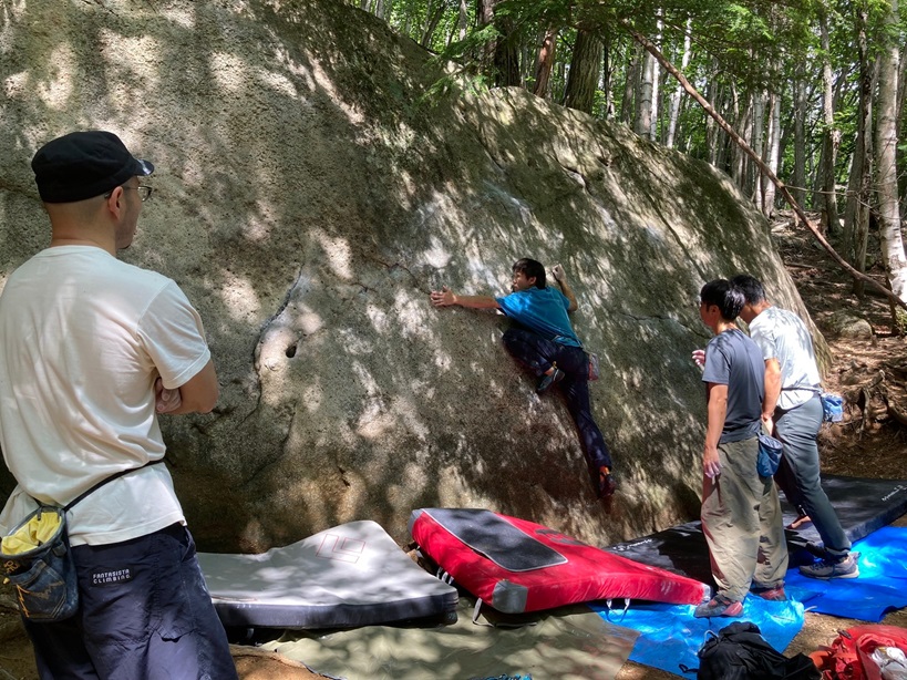 (廣澤)小川山はピン間が遠くグレード感も厳しく感じ痺れました。さわった課題はどれもおもしろく最高でした。以前より岩の中から足をおける場所を見つけられるようになっており自分の成長を感じることができました。小川山ボルダーで穴社員3級を登ることができたのが1番の思い出です。小川山の夜は毎晩美味しいものを食べさせていただき皆さまありがとうございました。