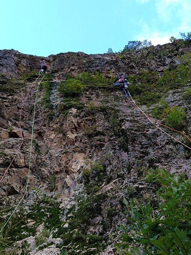 →QD→QD上ビナにアブミ→乗り移り→ロープクリップ→アブミ回収