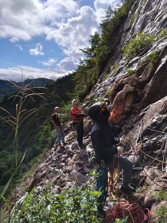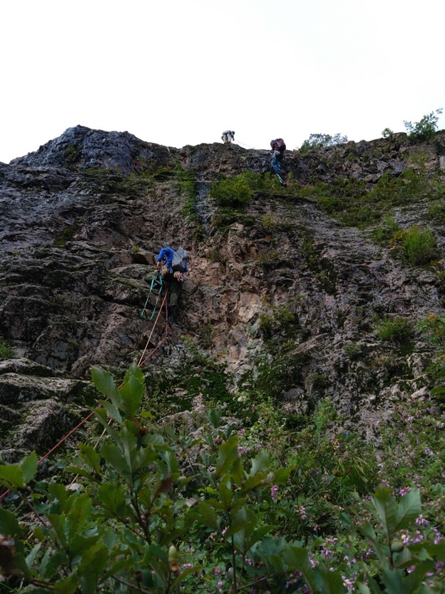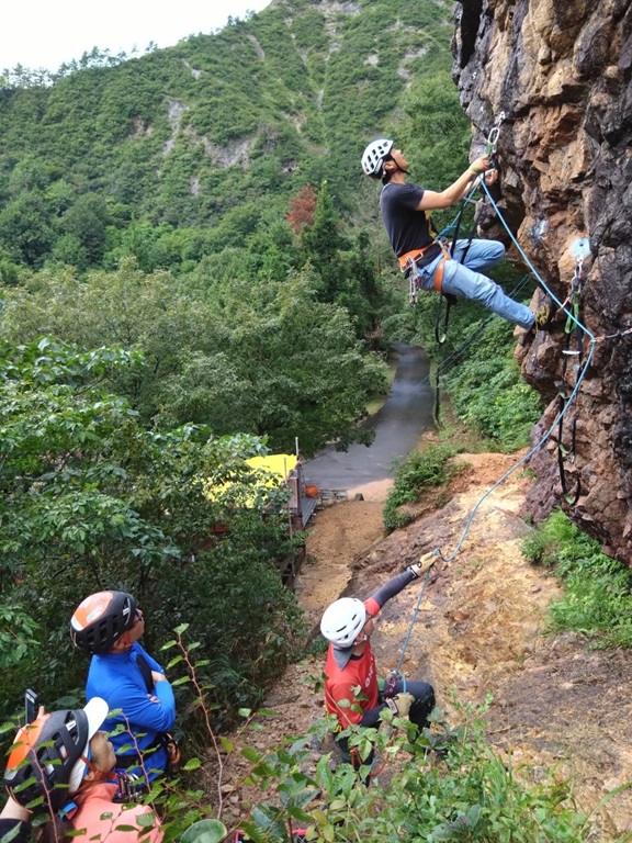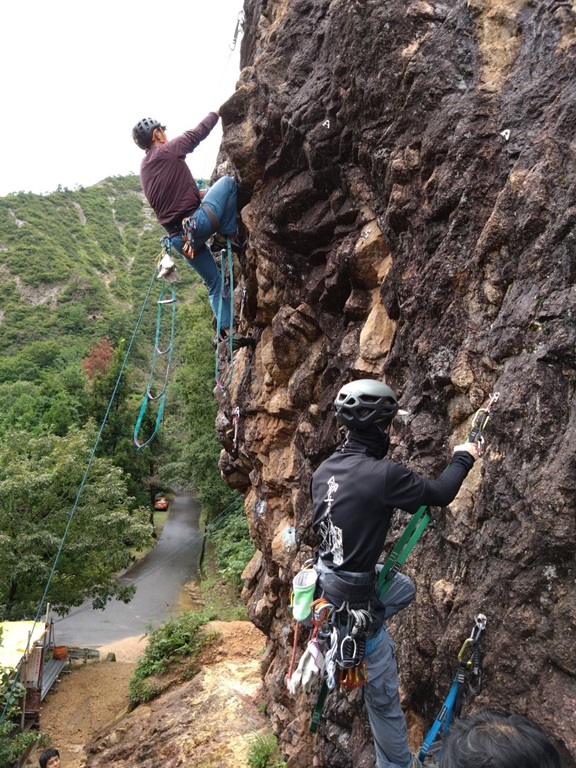 (進藤ま)生憎の天気のなか集合時間よりも早く来て濡れた岩の競技会ルートやマドンナを登っている参加者を見て偉いな〜凄いな〜と感心しました。午前中は大降りもせずに…でもシトシトと雨が降るなか東屋で巻込みのやり方を講習。皆さん思ったよりもスムーズに出来ていました。雨がやんでから「キョンシー」を実際に山宮会長からアブミで登ってもらいアブミの登り方を講習してから参加者全員にTRでアブミを使って登ってもらいました。お昼休憩後に上のアブミルートへ。雨はやんでいましたが沢登り状態の濡れ濡れの下部を登り取付きへ。全員にリードして貰う予定なので準備が終わった人から登ってもらおうとしたら何だかんだで私が一番手でリードする事になりましたが1年ぶりのアブミ登攀はスムーズに気持ちよく登れて良かったです♪上でセカンドビレイしながら隣のルートを登る13クライマーの佐藤君の登りを間近で上から見ることができ何だか得した気分でした♪左側のルートを忍さんがリードで登っていた時にテラスから上段のこれからっていう場所でアブミを落とすアクシデントがありました。実際にそういう事もあり得る事なので現在持っている道具の中から使えそうなスリングでアブミを作ったりセルフに荷重を移してアブミを回収し上へセットするなどして終了点へ無事にたどり着きました。大変だったとは思いますが良い経験になったと思います。その後佐藤くんがフォローで登る時にアブミ無しで登ってみましたが見事に登りきり(テラス上の所はアブミ使ったけど使わなくても登れそうですと)体感どれくらい?と聞くと10cd位とか…それくらいなら今度試してみようかなと思いました。2ルートを参加者各々がリードとフォローで登っている間にあっという間に17:00過ぎてる!!クライムダウンでは時間が多少掛かるので今回は懸垂下降で一気に降り無事にアブミトレ講習終了となりました。明星山左岩稜の参加者は本番までまだまだ時間はあるので現場でテンパる事のない様に皆で声掛けあって練習励んでください!