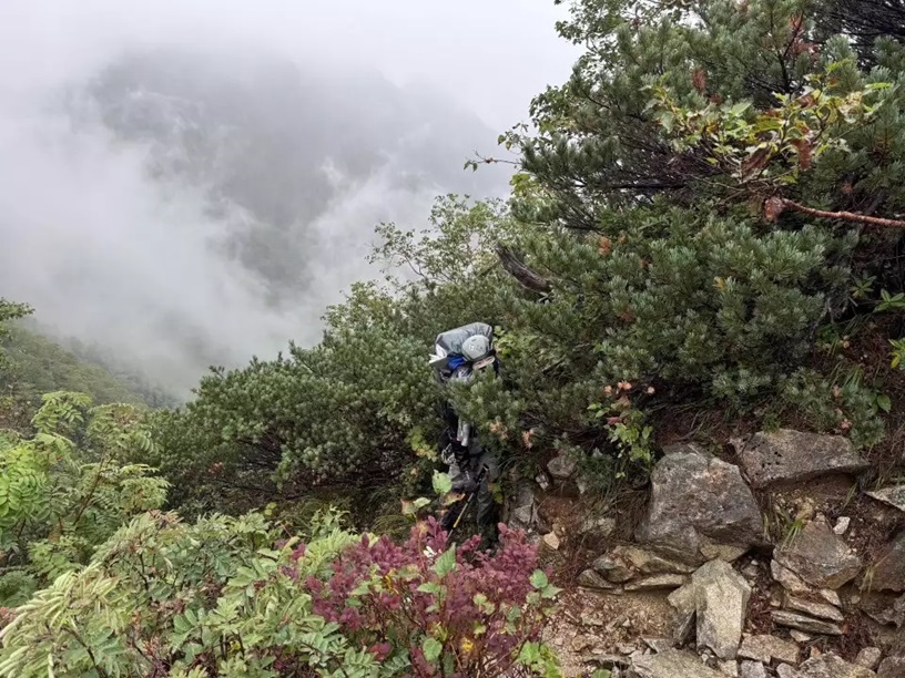 (木村)概要は、土田くんの感想の通りです。入山前の予報では、東北に掛かる前線次第では回復するのではと思い決行しました。実際は、前線が南下したため夜中から小雨になって敗退判断となりました。初日、時間的に北鎌沢のコルまで上がれましたが、荒天に振れた場合に北鎌沢は下降しにくいと考え、北鎌沢の出合を初日のテント場としました。結果、夜中から雨となり、北鎌沢のコルまで上がらなくて良かったと思いました。敗退のために水俣乗越を登り返すことになりましたが、このルートは想定していなかったためGPSを見ながらの遡行となり、感覚的に入り込んだルンゼで間違ってしまいました。4級程度の登れる滝が連続したところで下降に使われるルンゼでは無いことに気がつくべきでした。支点の取れる場所も無いため下降もできず、ガレまで詰めて尾根に逃げての藪漕ぎとなってしまいました。落石は気になりましたが、沢登りの経験が生かされ終始落ち着いて行動することが出来ました。今回、登頂は果たせませんでしたが、敗退シミュレーション、沢地形でのルートミスのフォローと良い経験となりました。敗退こそしましたが、予期せぬ大冒険と、未踏の表銀座、東鎌尾根を歩けたので私的には大満足の3日間でした。と、無事だったから言えますが、日々、山行の経験がなければ、遭難一歩手前だったなと反省しています。バリルートでは、異常に気づく力が重要だなと改めて思いました。