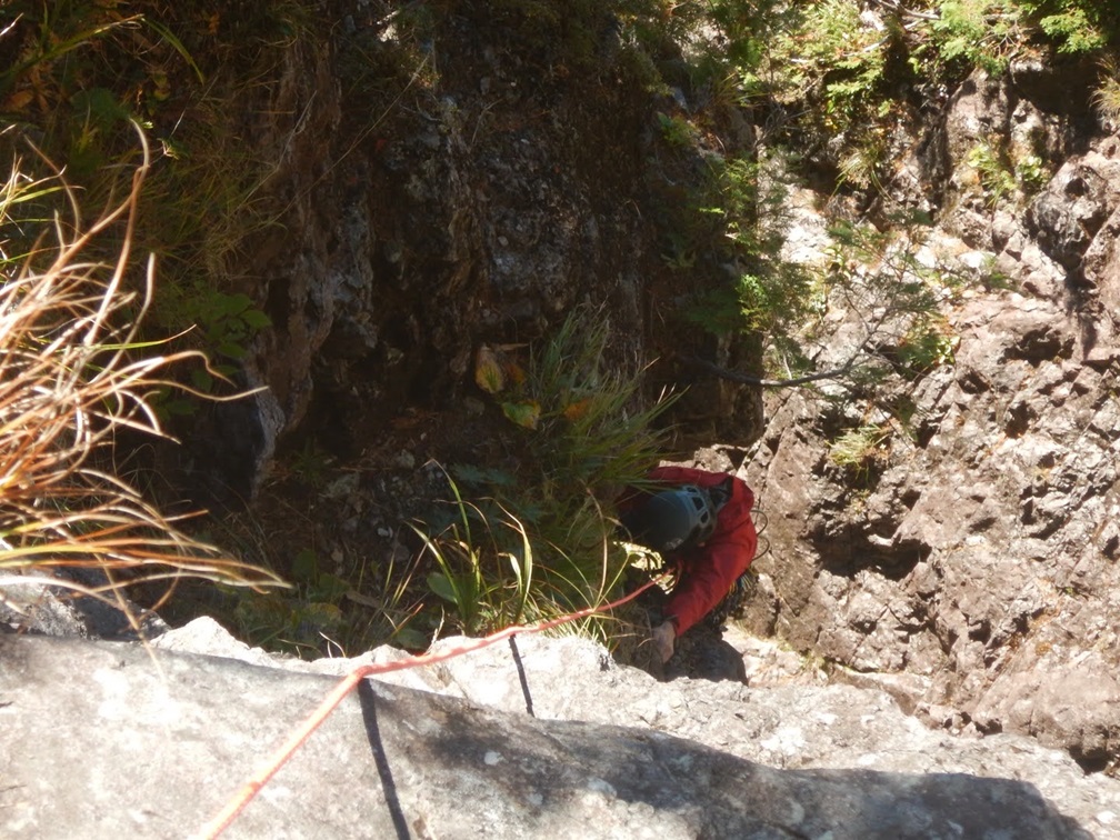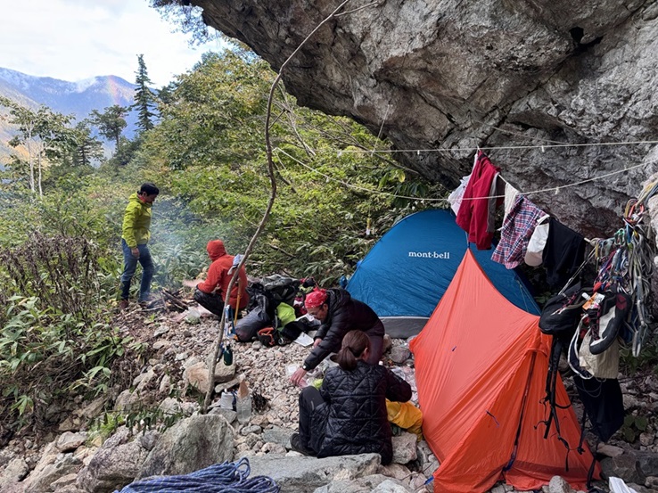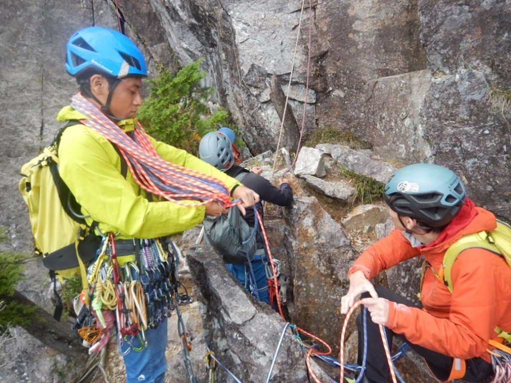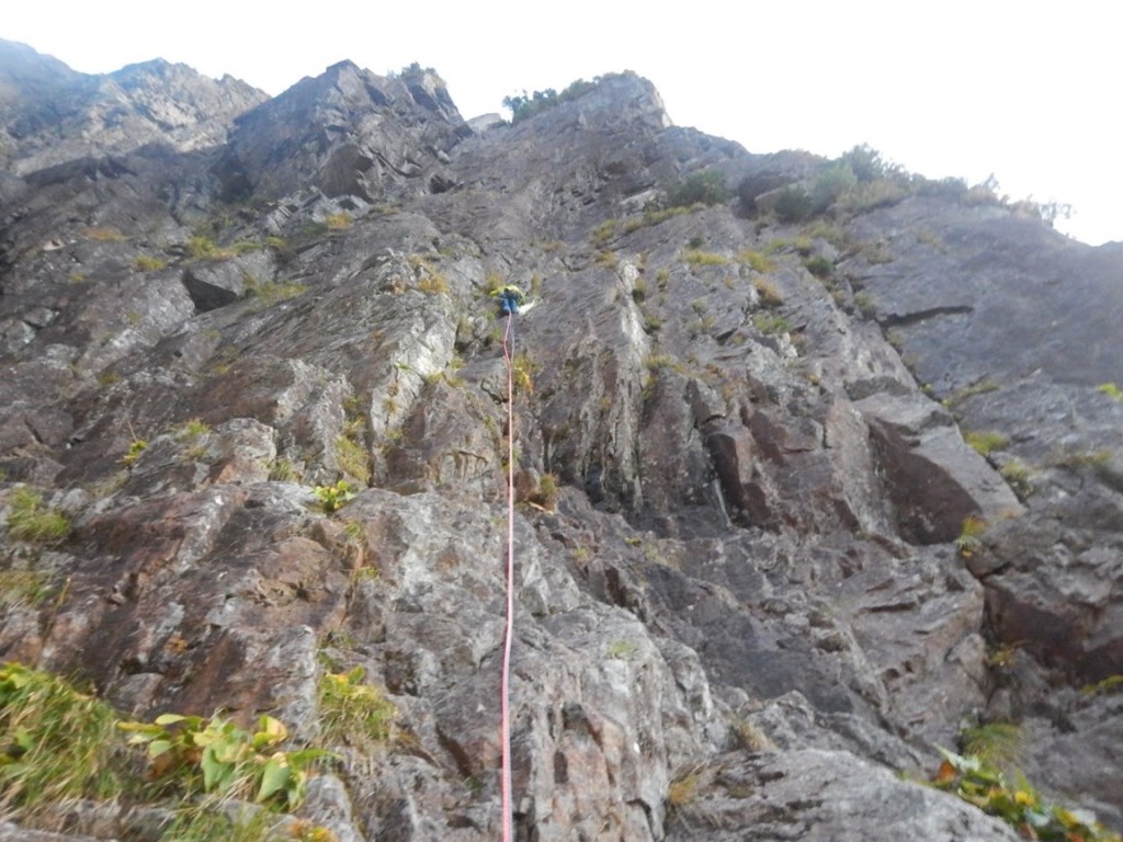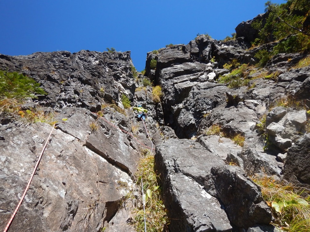 (佐藤)1日目、左方カンテ(11:00登攀開始→14:105p目終了点→1600取付き)懸垂で渋滞したので同ルート下降しました。核心部は今回登ってないので、よくわかりませんが、そこ以外は登りやすいです。最後の懸垂で面倒くさくなって繰り出し式懸垂をせずにロープを投げたらやはり絡まり、落石もありました。危うくロープを切るところでした。きれいにロープが落ちるところ以外はやはり繰り出し式だと改めて思いました。