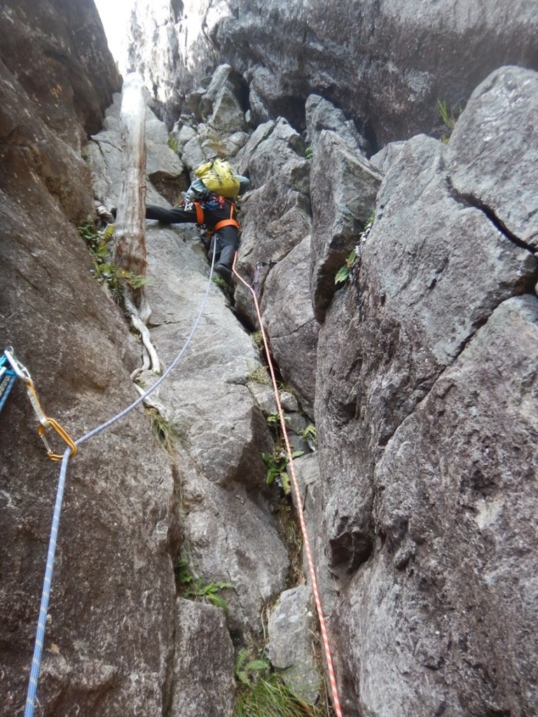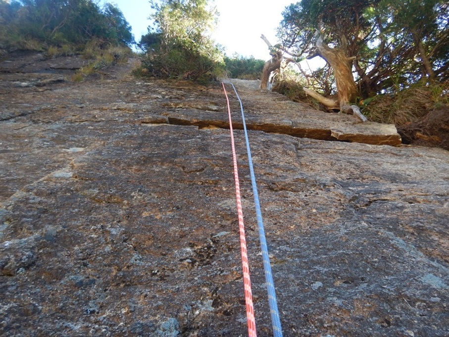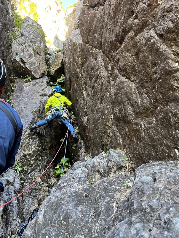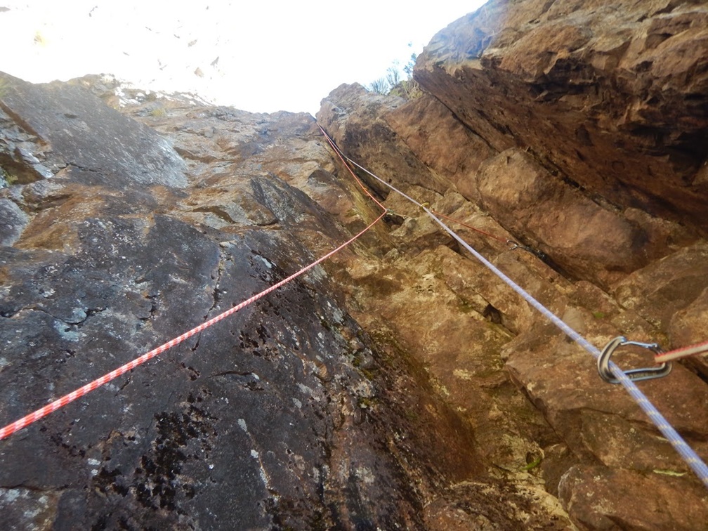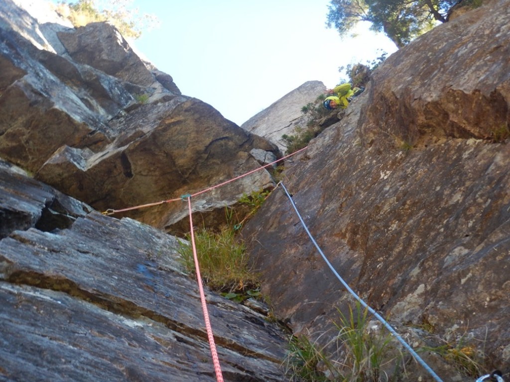 (佐藤)1日目、左方カンテ(11:00登攀開始→14:105p目終了点→1600取付き)懸垂で渋滞したので同ルート下降しました。核心部は今回登ってないので、よくわかりませんが、そこ以外は登りやすいです。最後の懸垂で面倒くさくなって繰り出し式懸垂をせずにロープを投げたらやはり絡まり、落石もありました。危うくロープを切るところでした。きれいにロープが落ちるところ以外はやはり繰り出し式だと改めて思いました。