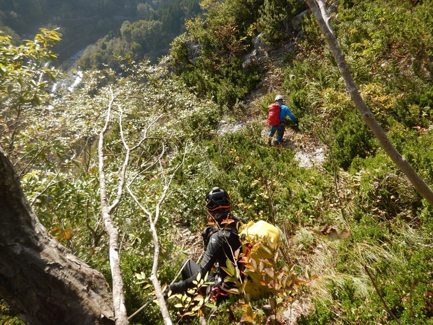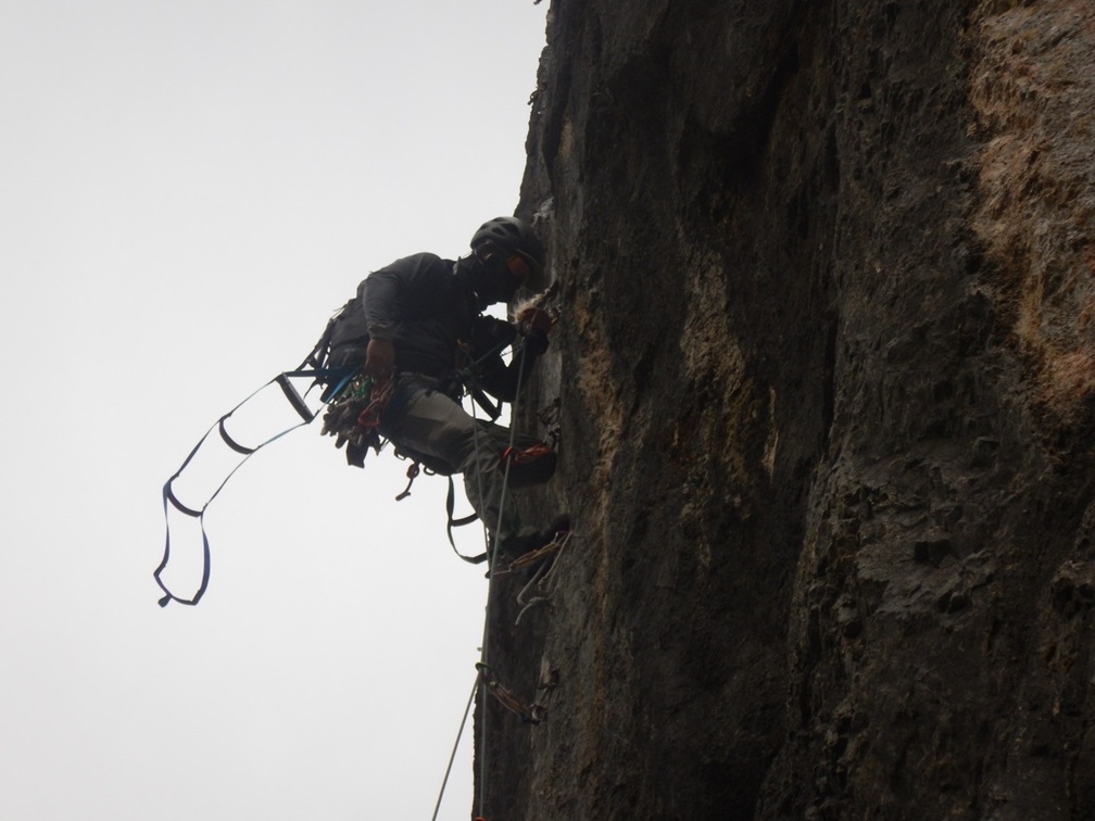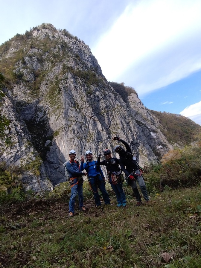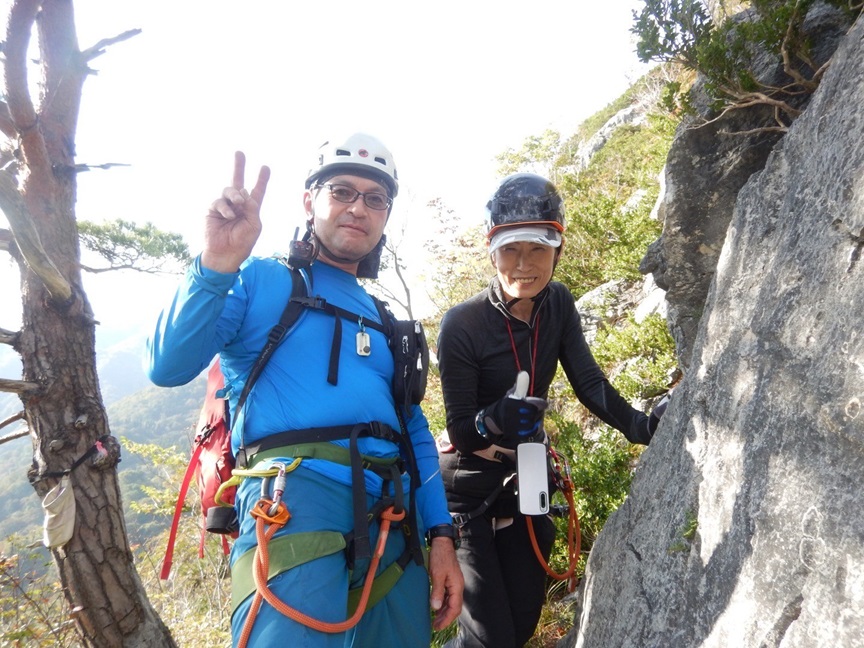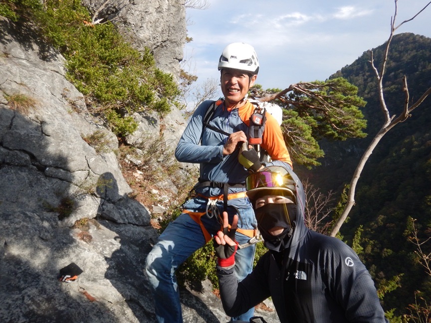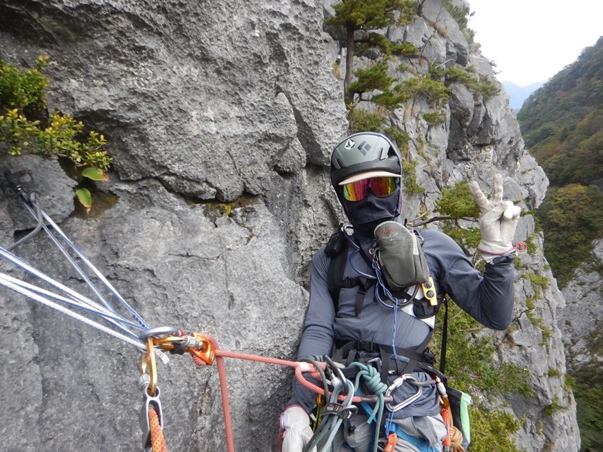 (土田貴)今年目標にしてた左岩稜無事に登攀でき嬉しかったです。まさかの貸切りでのんびりと木村さんに色々と教えてもらいながら登ることができました。貴重な時間でした。(時間がかかり過ぎだったのでスピードを意識して登るのも今後の課題です)アブミパートの3P目と最終7P目をリードしました。ヌンチャクは計20本持ちましたが途中5回くらい間引きながら登りました。ハンガーボルトのネジがおかしく2箇所クルクル、1箇所はハンガー自体がなく隣のリングボルト(縦にリングが伸びてる)にアブミで体重をかけるのが凄く怖かったです。今年ラストアルパイン?来シーズンはフリー力をもっとつけてリードパートを増やしていきたいです。この日のために指導してくださった皆様ありがとうございました