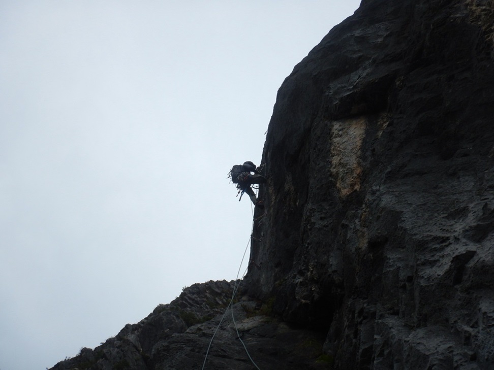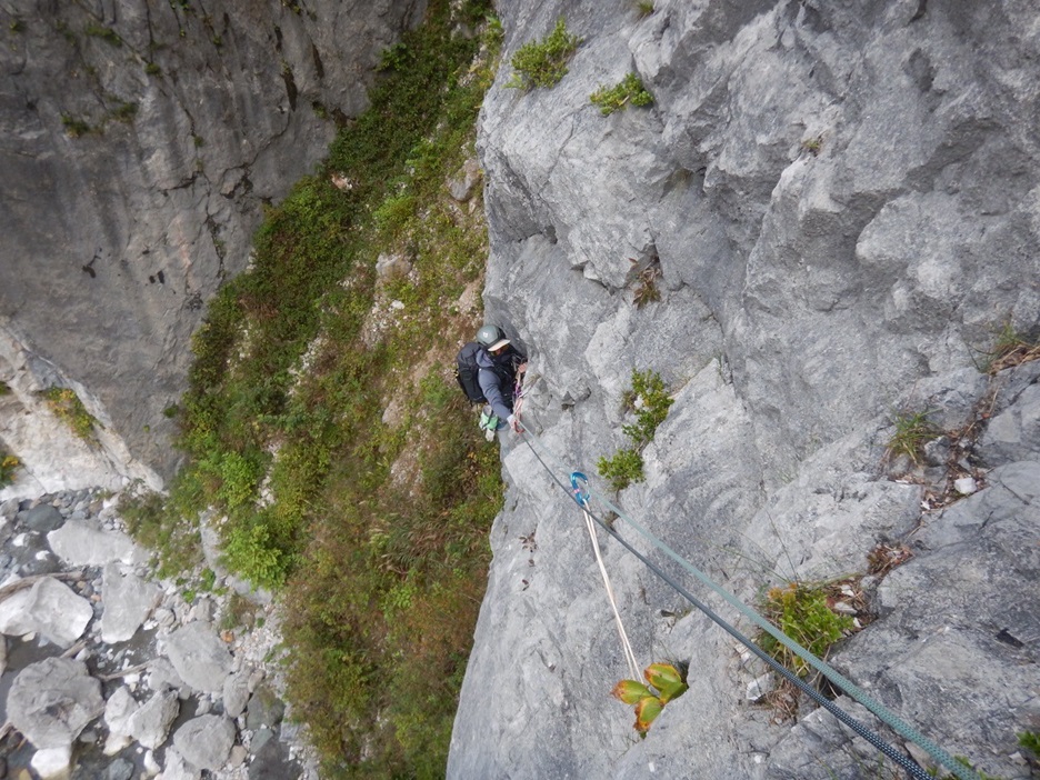 (木村)土田貴くんと組んでCLで登りました。久しぶりのリードとルーファイに緊張しましたが、大きなトラブルもなく2人で力を合わせ完登することが出来ました。実際のピッチは、トポと同じピッチで区切りました。総じて、岩のコンディションは悪い部分もありましたが、アルパインチックでそこも楽しめる範囲のものでした。簡単なグレードなので残置は少なかったですが、適宜、カムが使えたので安心でした。同時間帯に登攀を開始し、倍以上のピッチ数と3人パーティーのフリスピ隊より、下降路に到着するのが遅かったです。待ってもらって、一緒に下山しました。下降路は、初見では迷いやすいので待ってもらって良かったです。
