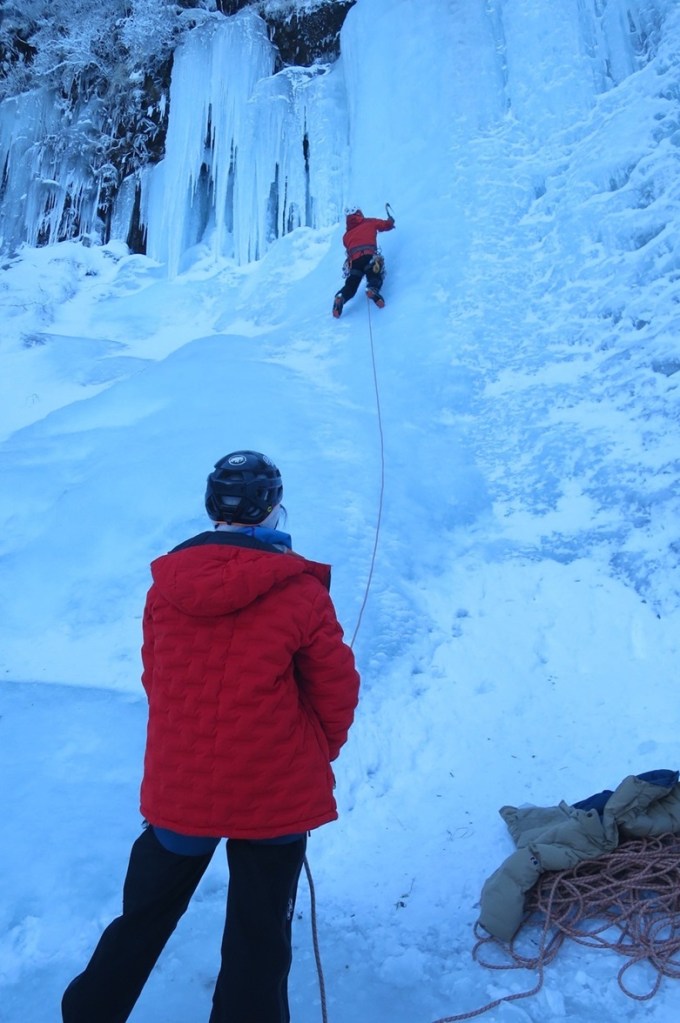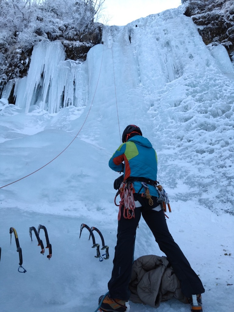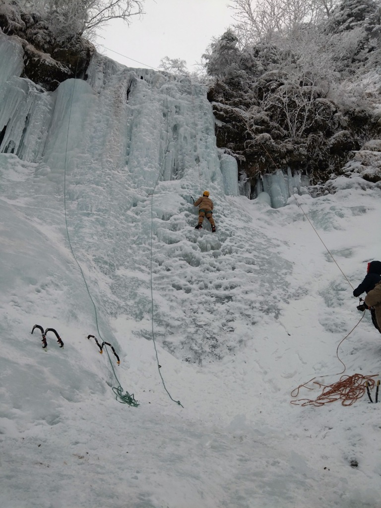 (進藤ま)今シーズン初アイスは2日間とも安心のTRで楽しく登らせてもらいました。アックスやリンクスの効き具合を確認出来て良かったです。アイスギャラリーはヤマップ等の前情報で混雑しているとあったので登るところあるかな〜と心配しましたが年末だからか思ったより混雑なく今回参加されたお二人もたっぷり練習出来た様で良かったです。