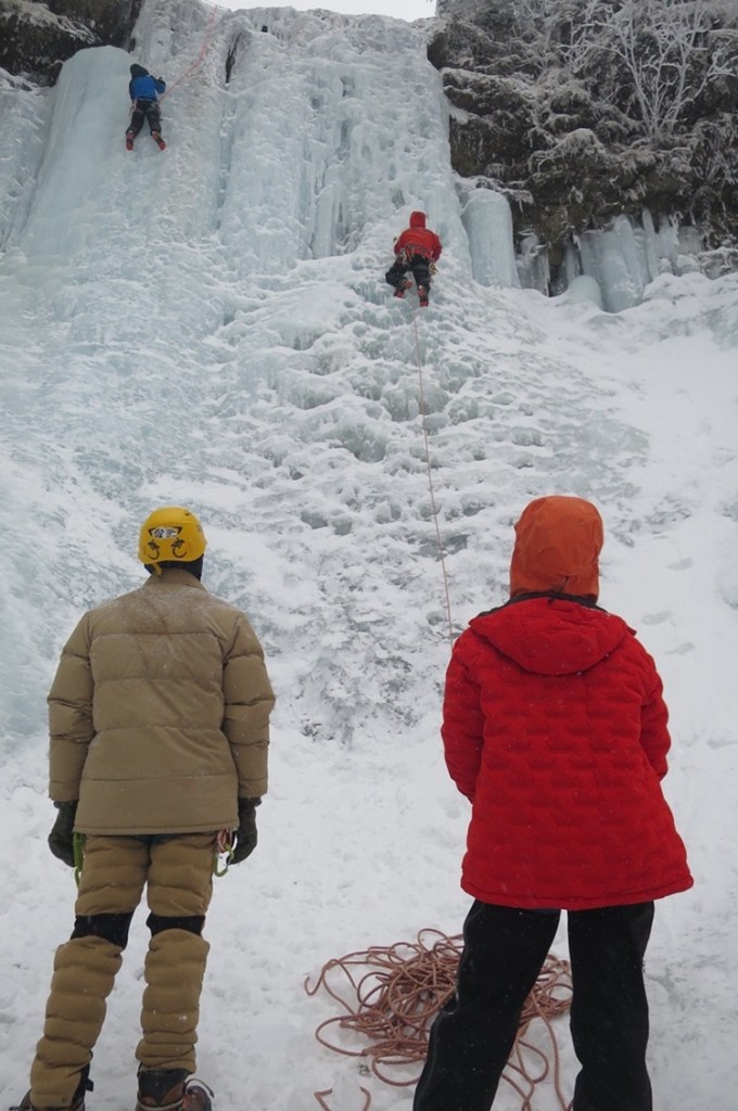 (進藤み)G4エリアは事前情報では大混雑が予想されましたが2日間とも快適に使えアイス猛練習には良かったです。宮崎さんは昨シーズンよりもアックスの打ち方、登り方が上手くなっていました。ですが何本も登り疲れてくると足に乗れなくなり雑に蹴るようになりアックスへの荷重確認も疎かになり剥がされるようになっていたので、そこに注意し練習しましょう。貴幸くんはほぼ初めてなのにある程度教えると上手く登っていると思いました。垂壁になった時に引きつけている前腕にいつまでも力が入ったままで腰が氷から少し離れ足に乗り切れずパンプする様でしたので次の課題ですね。それと今回は疑似リードだけだったので次はリード頑張ってください。私ですが今シーズン初アイスリードで、しかも体重が重く緊張しました。登れましたが2日目に登った左側ですが滝の途中から水氷でアルミのスクリューしか無くセットする瞬間から凍って入らなくなり何とかセットしを数本繰り返し辛かったです。大滝ならテンションしていたと思います。少し重くてもステンレスのスクリューを数本買おうかなと思いました。最後に何度か泊まったことのある夏沢鉱泉小屋ですが送迎あり、ベットに羽毛布団、湯たんぽ、それに温泉と至れり尽くせりで何よりも小屋から滝まで30分弱と改めて最高だと思いました。美味しい夕食後の部屋での宴で4人で色々と盛り上がり就寝中は宮崎さんが寝言で元カノ?今カノ?の名前を叫びながら会話していました。どんな夢を見ていたのでしょう(笑)等…楽しい事ばかりの2日間でした。