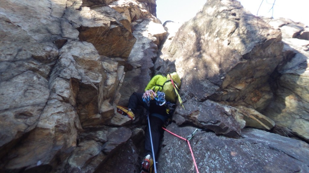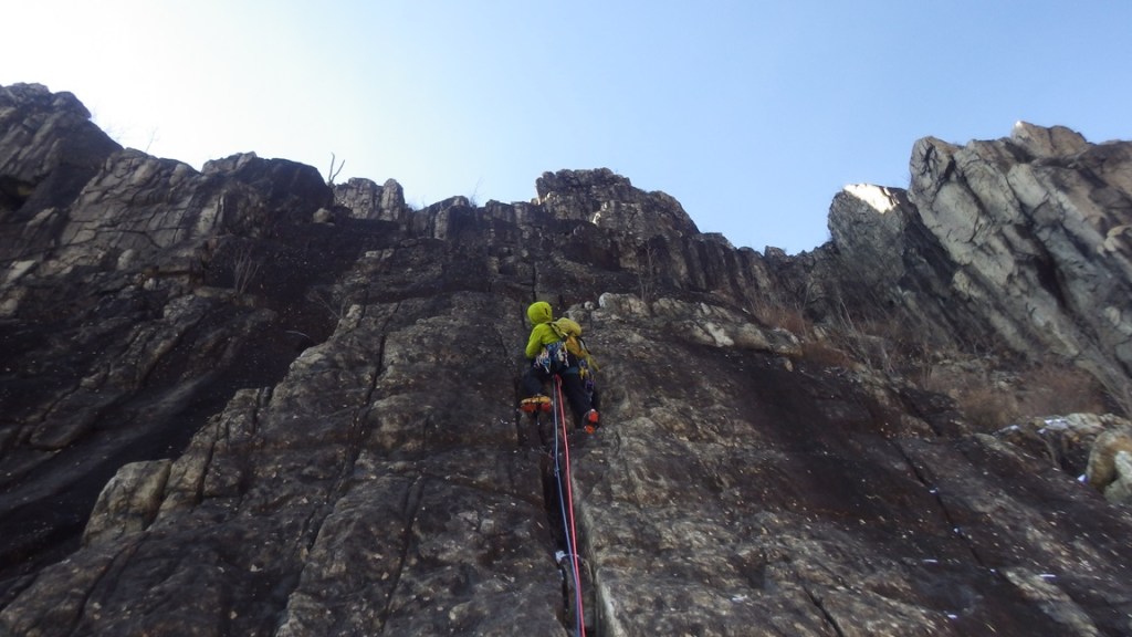 ・取付からクラックを直上して抜けたところでピッチを切ります。(終了点は角岩残置スリングをトライカム2つで補強。)