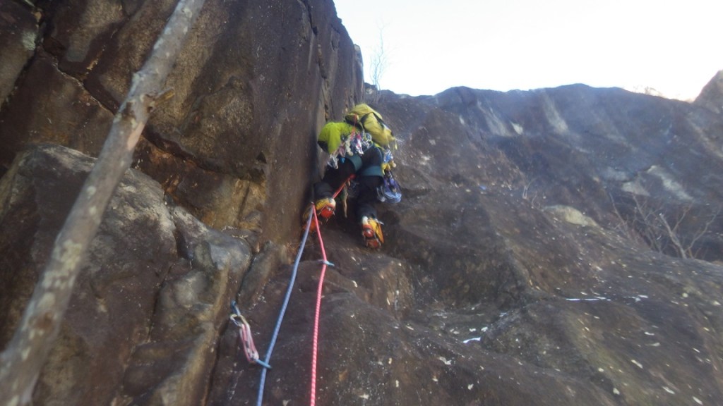 ・上部の右フィストのクラックでアイゼン前爪が滑ってフォールしかけましたがフィストが決まっていたので何とか耐えられました。