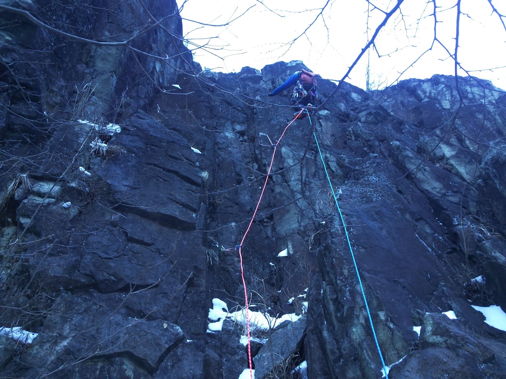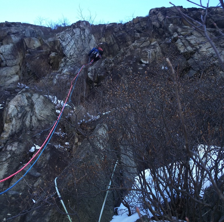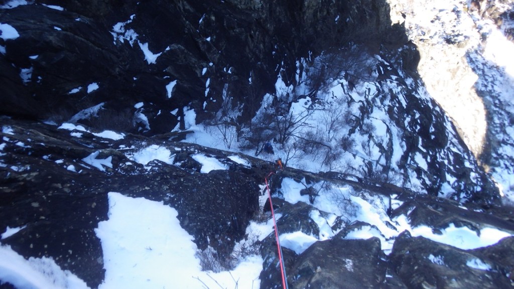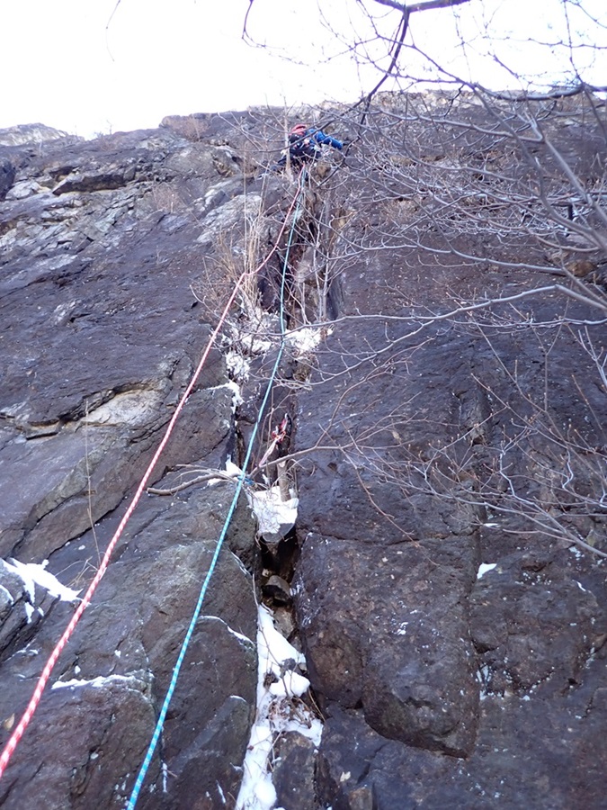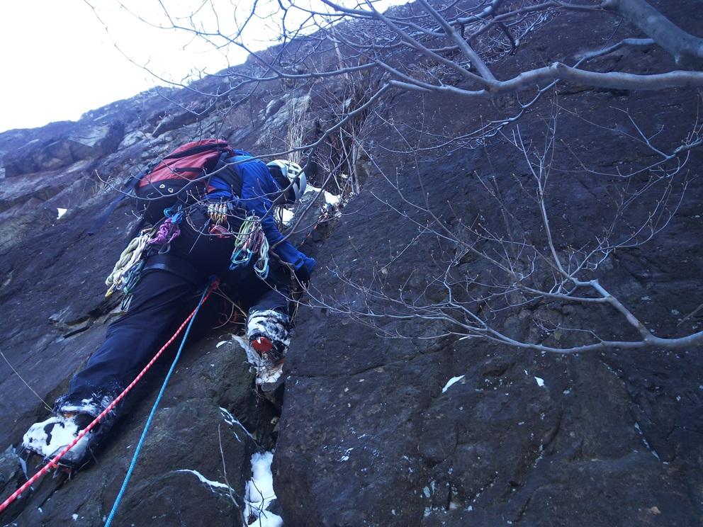 ・終了点からバンドを右へ回り込んで岩~雪面を登ります。岩セクションはスラブで若干ムズい?ですが短いので問題ありません。凹角の階段状は雪が付いているので歩きです。4P目の壁まで50mロープが届かなかったので途中の灌木で終了点を構築。4P目スタート地点(壁にハンガー1つあるところの左の浅い凹角基部)までの残り10~15mぐらいはコンテで歩き。