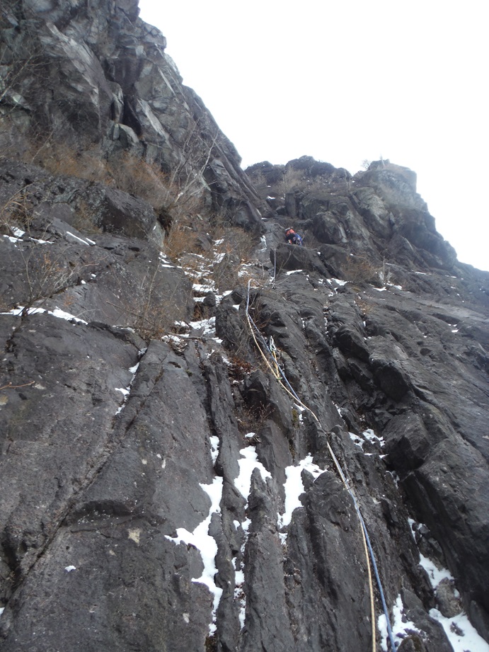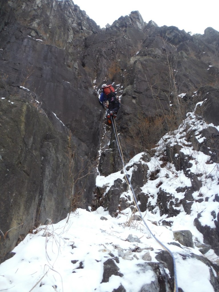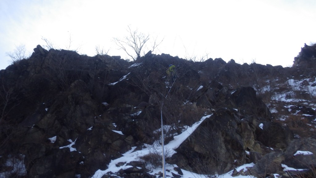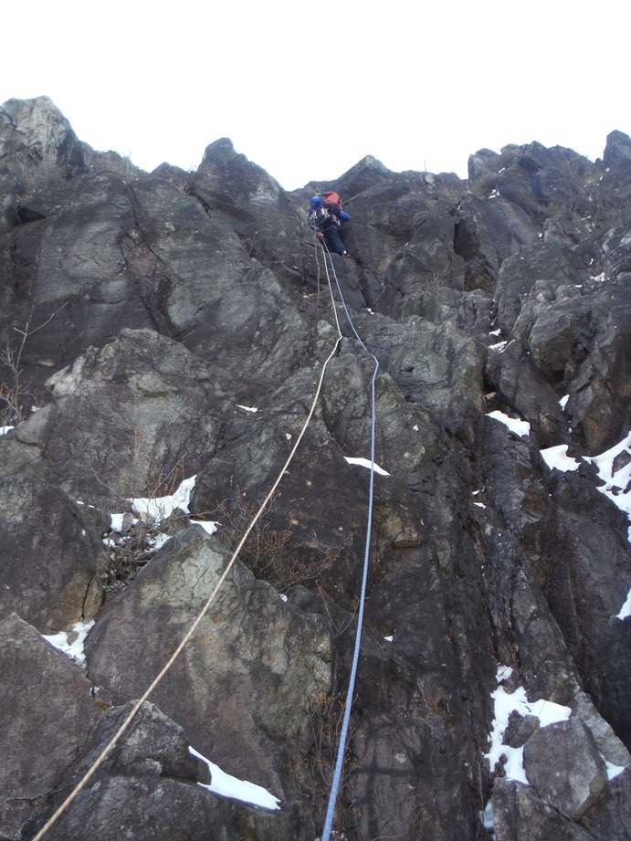 ・凹角をどん詰まりの岩は左から階段状を登るルート(Ⅲ)と右からクラックを登るルート(Ⅳ)がありましたが冬期のアイゼンでの登攀の場合は左から無難に登られているらしく今回もそれに習い左から登りました。