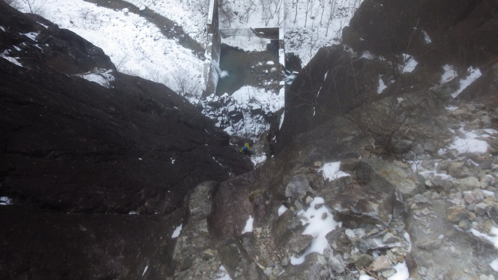 ・5P目終了点へは6P目の終了点にした角岩に捨て縄を巻いて懸垂下降。その後は各終了点でピッチを切りながら5回の懸垂下降で取付まで下降。(計6回の懸垂下降。)