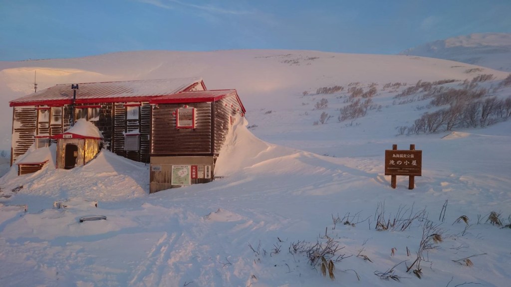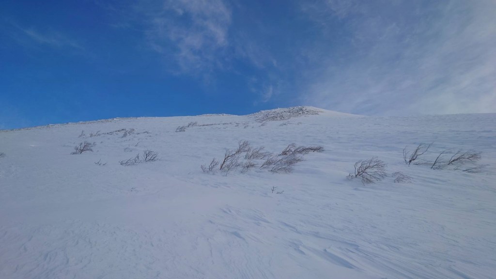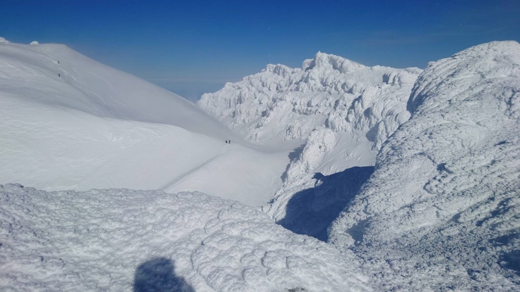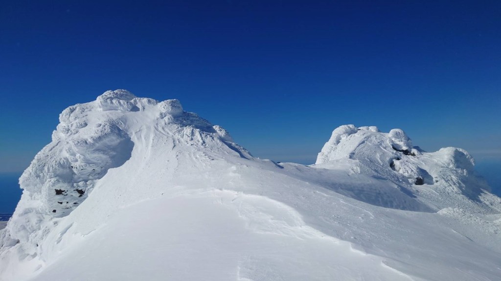 ★感想:長い樹林帯を抜け、滝の小屋から外輪目指し登り始めたときは、快晴無風のこれ以上ないコンディションだったのですが、外輪が近づくにつれ西風が強くなり、緩い装備で登ってきたので外輪直下と外輪でのブリザードに危うく低体温症になりかけました。厳冬期の山は舐めてはいけないなと思いました。また、外輪山では薄い氷に雪が乗っていて、胸まですっぽりと落っこちるような大きな穴もあったので、岩場である外輪と新山周辺ではヘルメットは必須だと思いました。なにはともあれ陽射しはあったので、烈風の中ではありましたが冬の鳥海の絶景を楽しむことが出来ました。