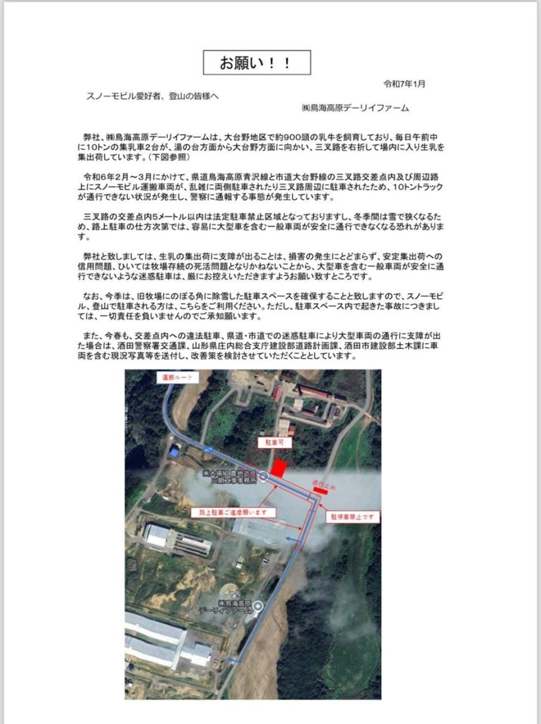 ★注意喚起:除雪終了地点のT字路付近に駐車車両があると牧場の方で大型車両が通れないことがあり困っているそうです。そこで、鳥海デーリイファームのご厚意で駐車スペースを設けたので、登山、BC、スノーモービル等で入山される方はこちらの駐車スペースを利用して下さいとのことでした。