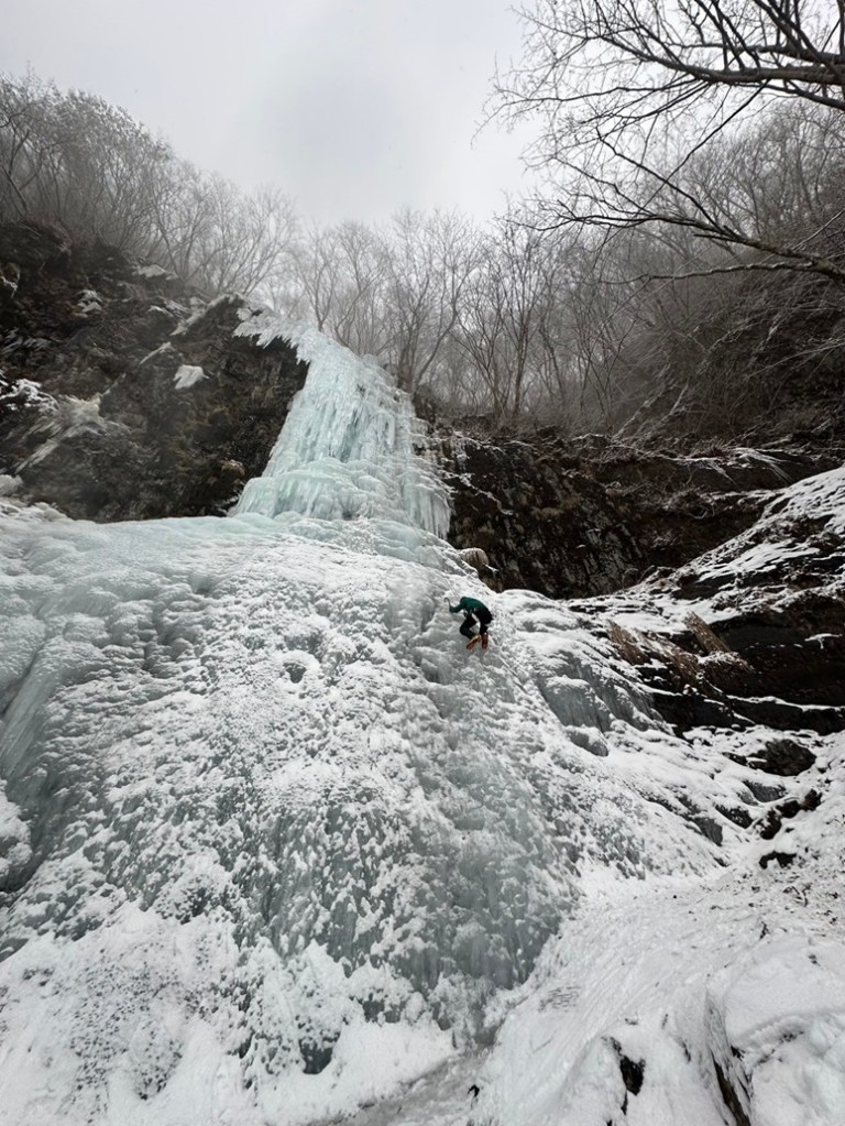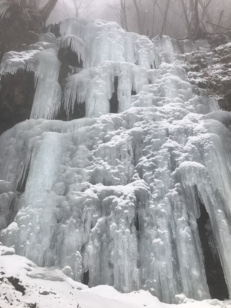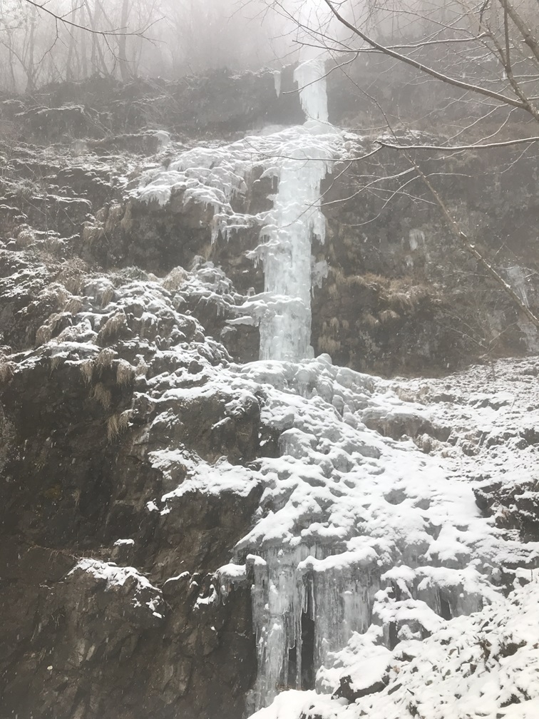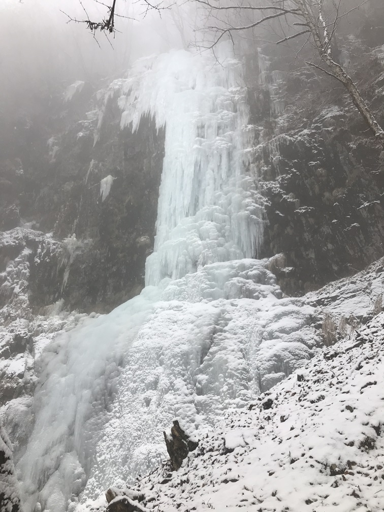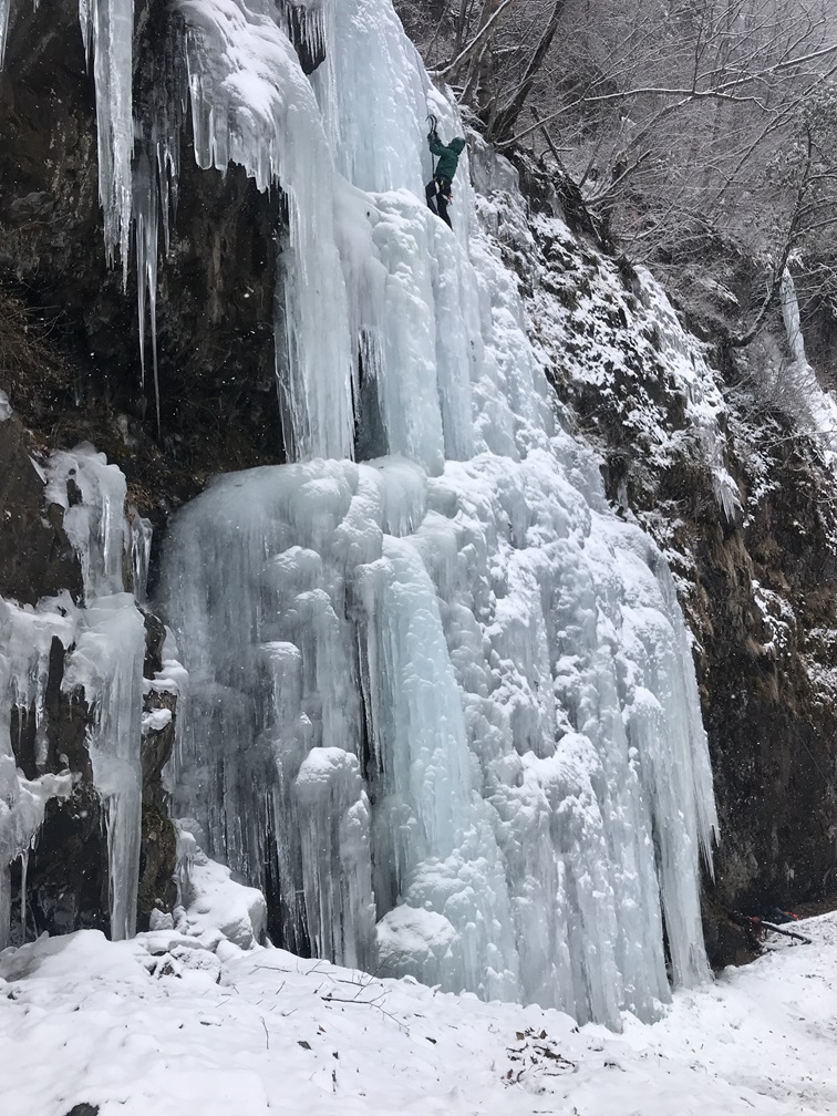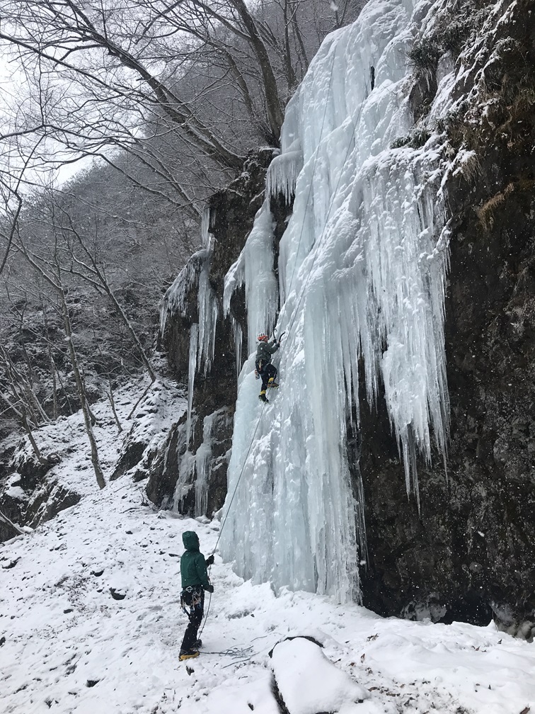(阿部)2年振りの本当に久しぶりのアイスクライミングでした。まだ行ったことがない場所だったので1度行ってみたいと思い参加させて頂きました。アプローチは大変歩きやすいよく整備された里山の登山道の様で、杉の落ち葉が踏み心地の良いアプローチでした。今回はアプローチは凍った箇所もなく滑ることもなかったです。チェーンスパイクが重宝すると言う記事があったので用意はしていきましたが、山宮さんの助言どおり必要なかったです。一般登山道との分岐も案内板が各所にあり地図を前もって見ていけば迷うことなく氷瀑へたどり着けます。本題のアイスクライミングの方は全くお話にならず、エイプリルフールを3分の2ほどトップロープで登らせて頂き、あとはビレイヤーとしての職務に専念してました。氷は山宮さんの記述どおり、硬すぎず弱すぎず程よい氷で登り易かったです。今回は全く力不足の状態で挑んだにも関わらず、参加させて頂き大変有難かったです。WESTで定期的にクライミングして行きたいと思います。