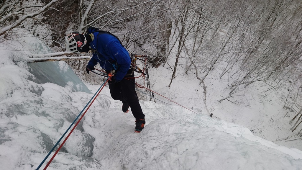 (山宮)相沢奥壁の氷はカチカチの硬い氷でもなくシャバシャバの水滴る氷でもなくアックスが決まりやすい登りやすい氷でした。エイプリルフールは簡単な右側ライン(Ⅳ-ぐらいかな?)をリード(スクリューは4本使用)で登ってトップロープでは中央×2回(Ⅳ~Ⅳ+ぐらいかな?)登りました。大氷柱は簡単な右側ライン(Ⅳ-~Ⅳぐらいかな?)をリード(スクリューは8本使用)で登って土田しさんがフォローで登ってきてそのまま懸垂下降で下りました。