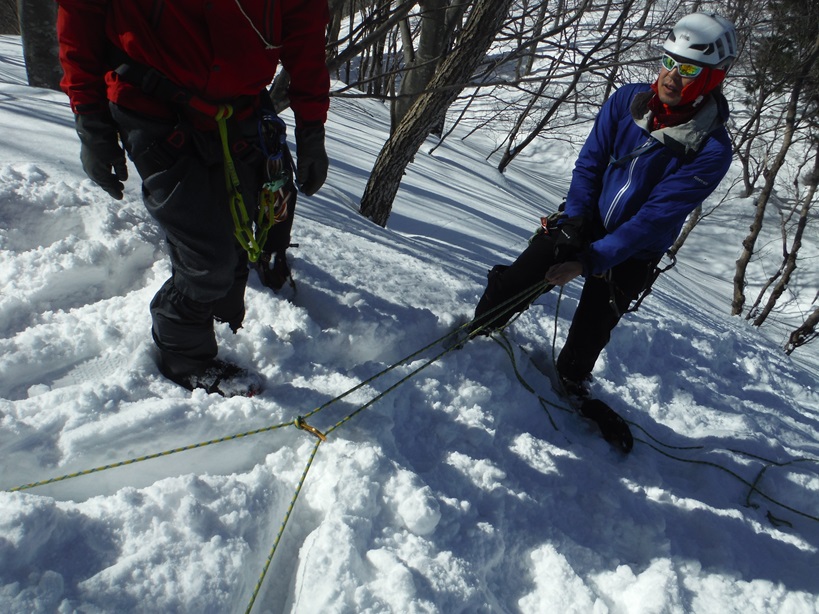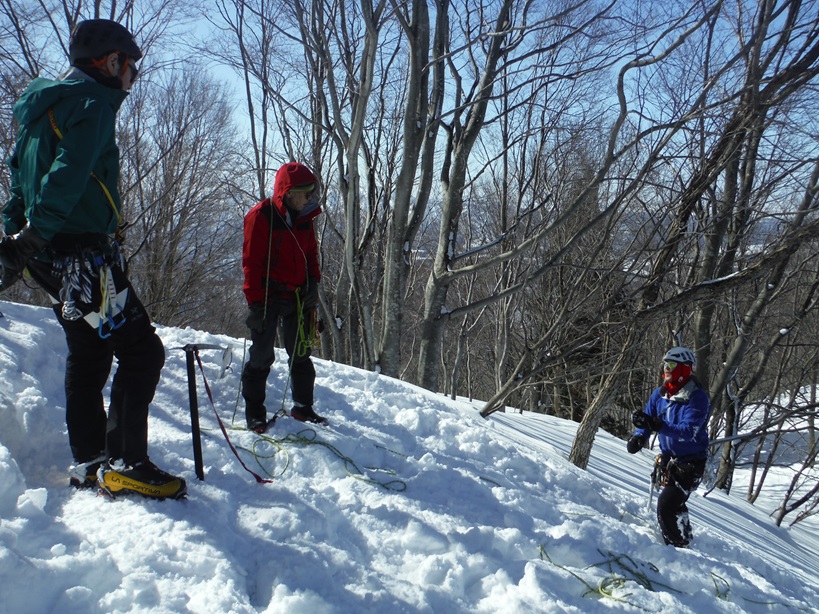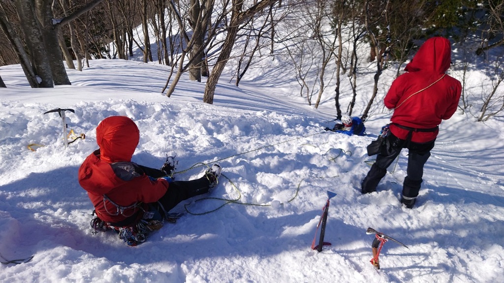 ・雪上での支点構築(スノーバー縦刺し・横埋め、アックス横埋め)